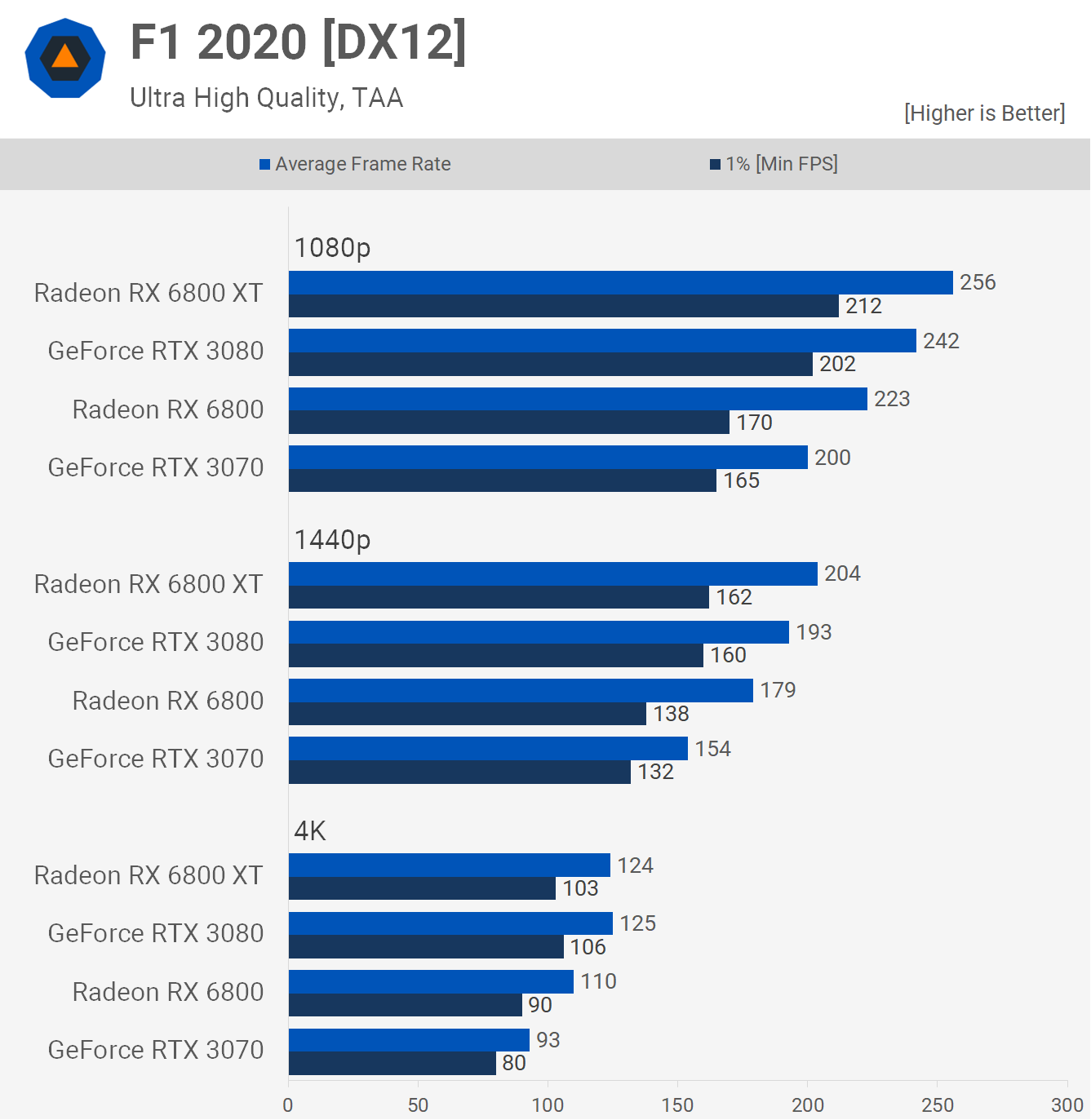 F1 2020 is an Nvidia Gameworks title but it's always run well on AMD hardware. Here we can see the 6800 XT offers slightly more frames at 1080p and 1440p, though it's a mere 6% advantage at 1440p. At 4K results are more evenly matched.