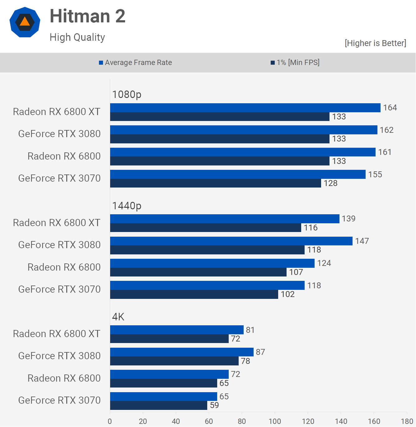 Here the RTX 3080 and 6800 XT are evenly matched with the GeForce GPU winning by a slim 6% margin. That difference is increased at 4K to just 7%, making the RTX 3080 slightly faster in Hitman 2.
