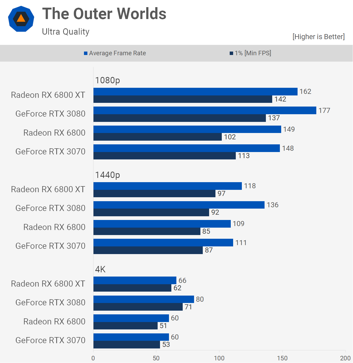The 6800 XT is just 3fps faster at 1080p on average. The RTX 3080 then pulls ahead at 1440p to win by a 5% margin and then a more significant 11% at 4K allowing the GeForce GPU to reach 40 fps which does make the game noticeably smoother.