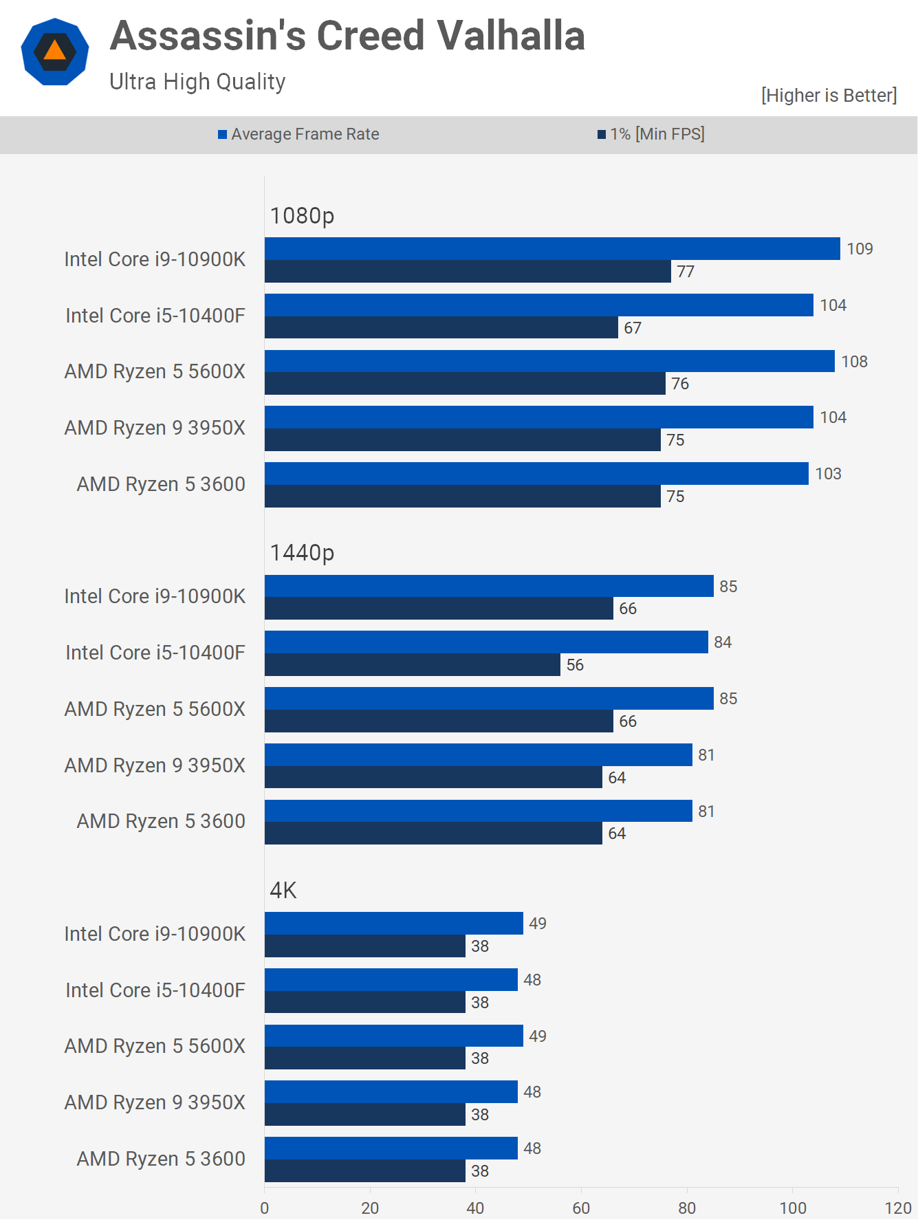 Assassin's Creed Valhalla saw similar performance across all CPUs tested, the 1% low results were slightly lower with the 10400F, while the 5600X matched the 10900K.