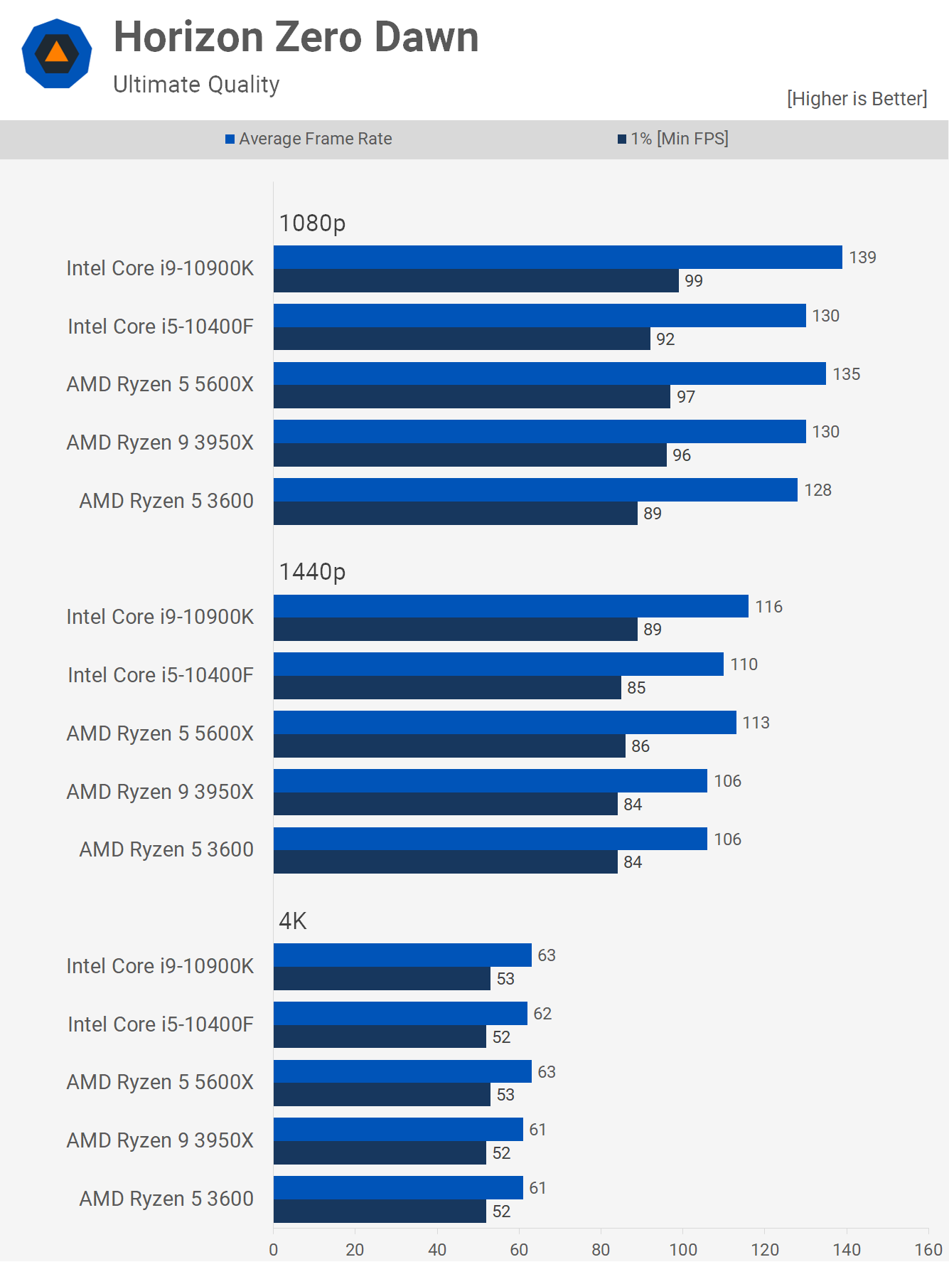 Not much to see in Horizon Zero Dawn either, the 5600X was just 5% faster than the 3600 at 1080p and 3% slower than the 10900K when testing at 1080p.