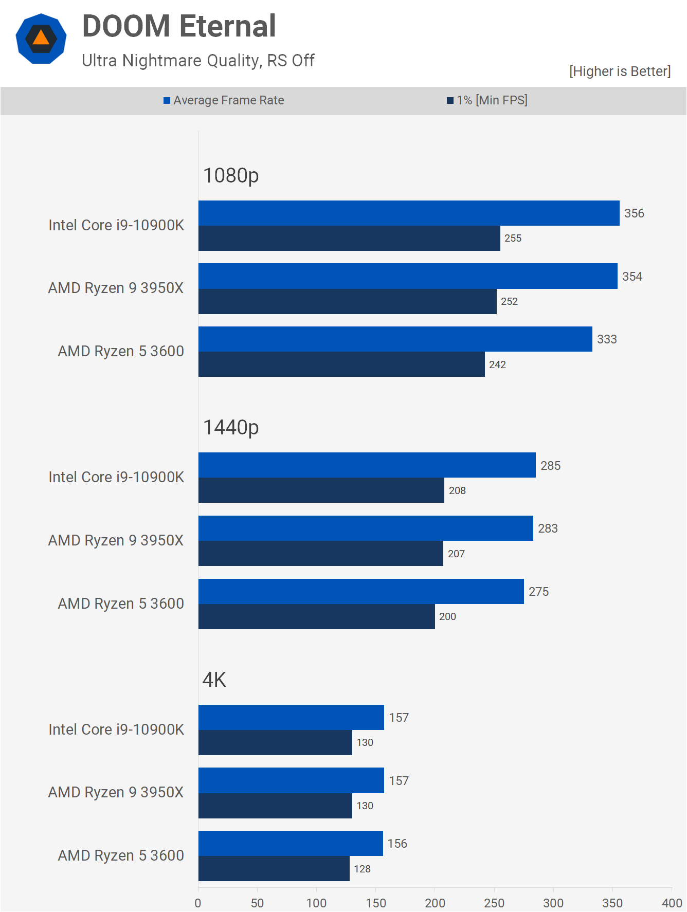 Doom Eternal is yet another game that's more GPU bound, though at 1080p the R5 3600 was 6% slower than the 10900K, at 1440p performance is the same and then we're looking at identical frames at 4K.