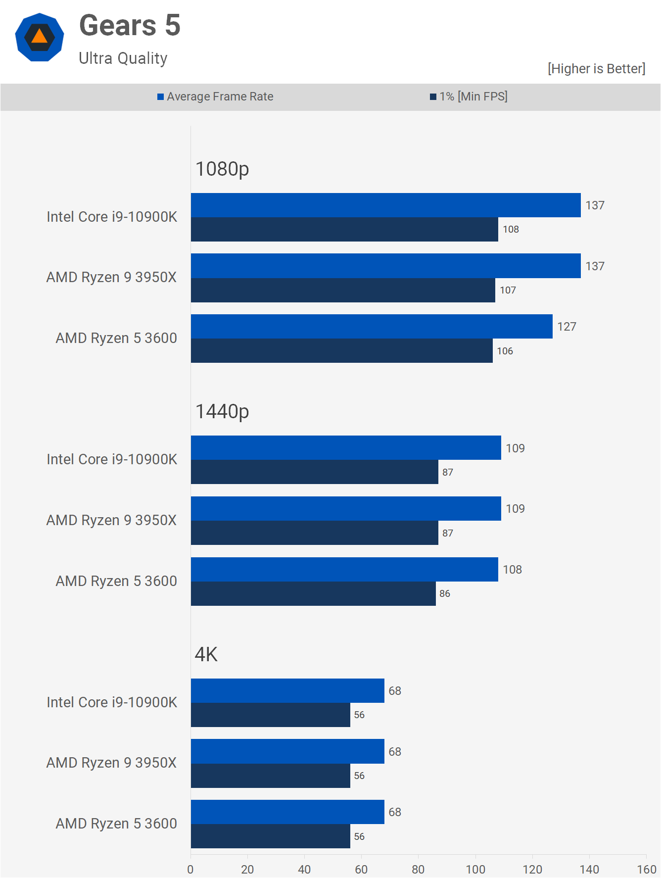 Finally we have Gears 5 results, where the 3600 only dropped a few frames at 1080p and was able to match the flagship processors at 1440p and 4K. A great result overall for the plucky little 6-core Zen 2 processor.