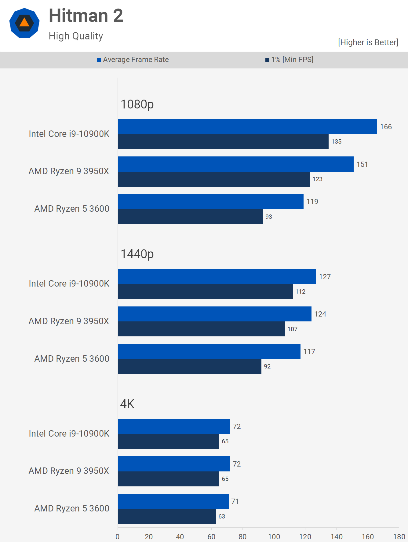 Hitman 2 behaves a lot like Death Stranding. We're looking at a 27% performance boost from the R5 3600 to the 3950X at 1080p, while the 10900K is almost 40% faster. However, at 1440p those margins are drastically reduced as the game requires more GPU power, so now the 10900K is just 9% faster than the 3600 and at 4K we see no difference at all.