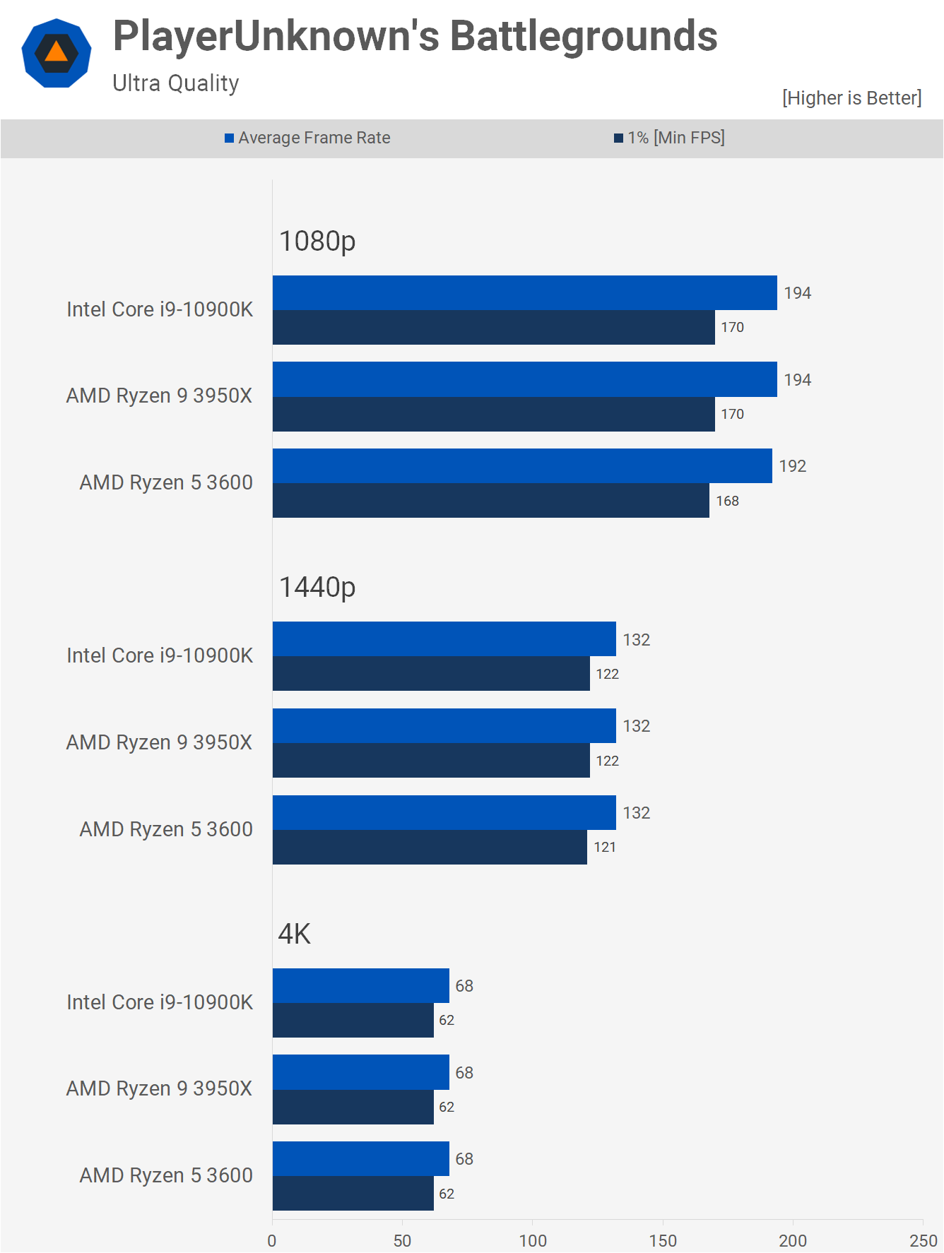 PUBG now plays a lot better on Zen 2 processors. Here we see the R5 3600 matching the 10900K at all tested resolutions.