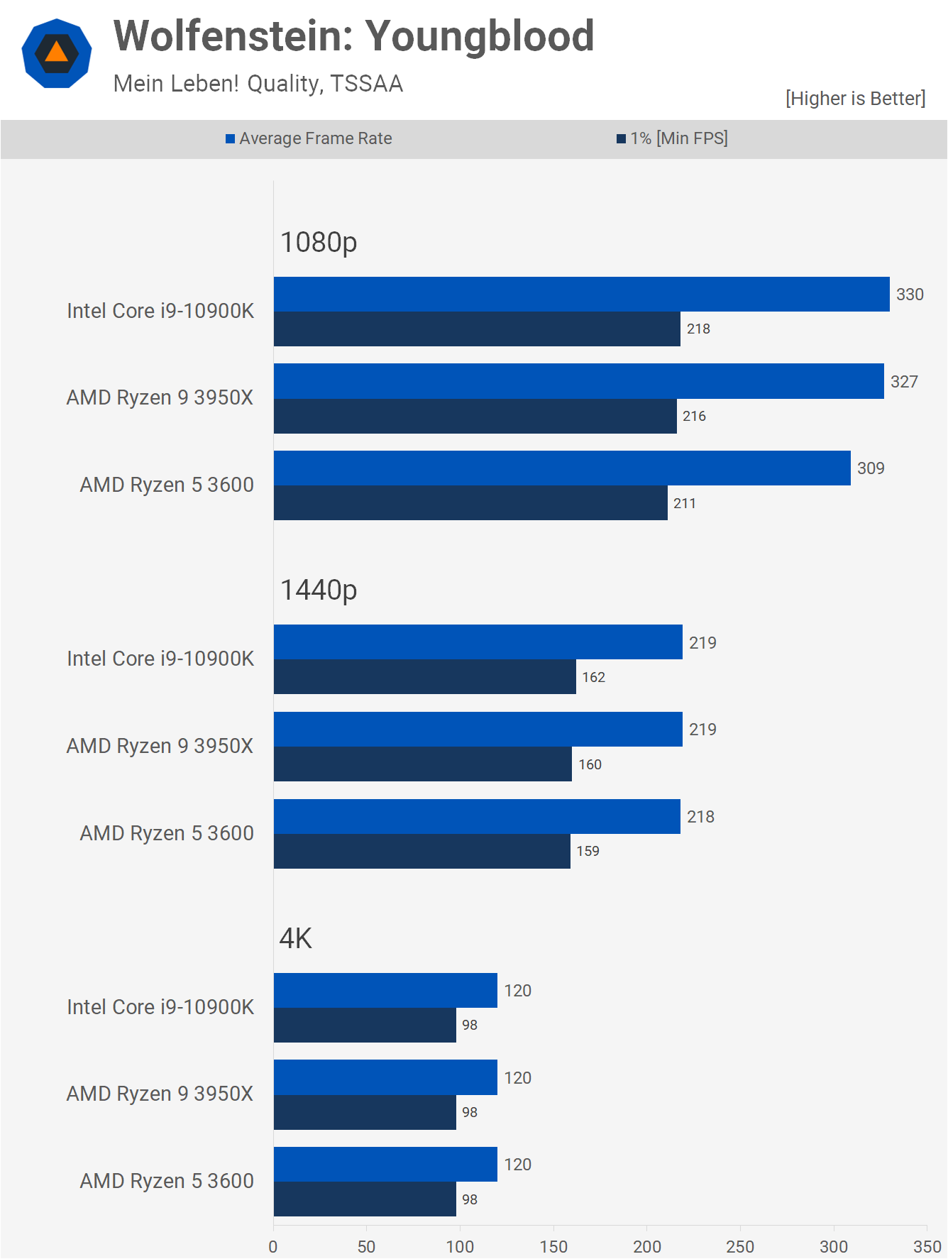 Wolfenstein: Youngblood like most games isn't CPU limited when using modern 6-core/12-thread processors like the R5 3600. Therefore we're seeing comparable performance between the 3600, 3950X and 10900K.