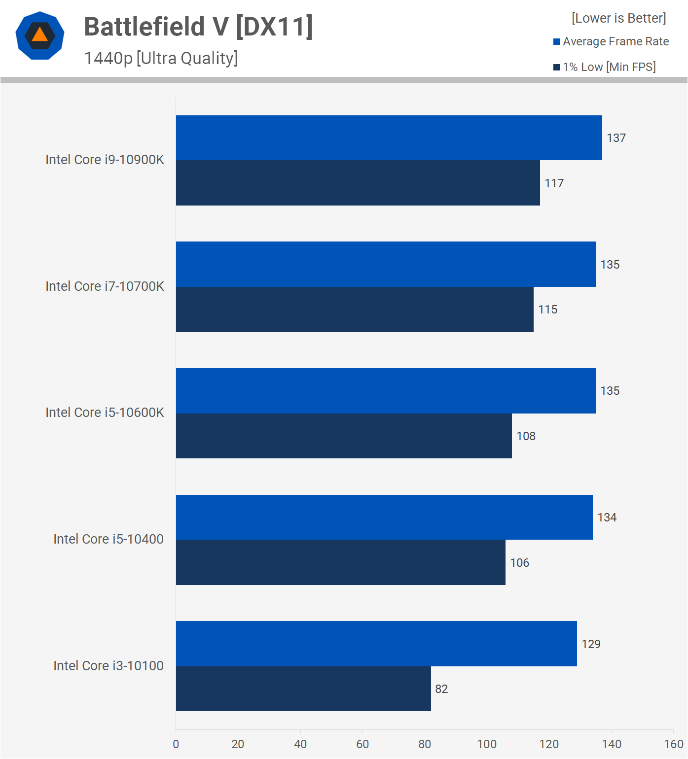 We see a further 6% decline in performance with the 10400 and then a rather large 22% drop off with the 10100. However, by increasing the resolution to 1440p for a more realistic test scenario, we find very little difference in performance between the 10400, 10600K, 10700K and 10900K. In fact, the average frame rates are virtually identical while the 10900K is at most 10% faster than the 10400 when comparing the 1% low performance.