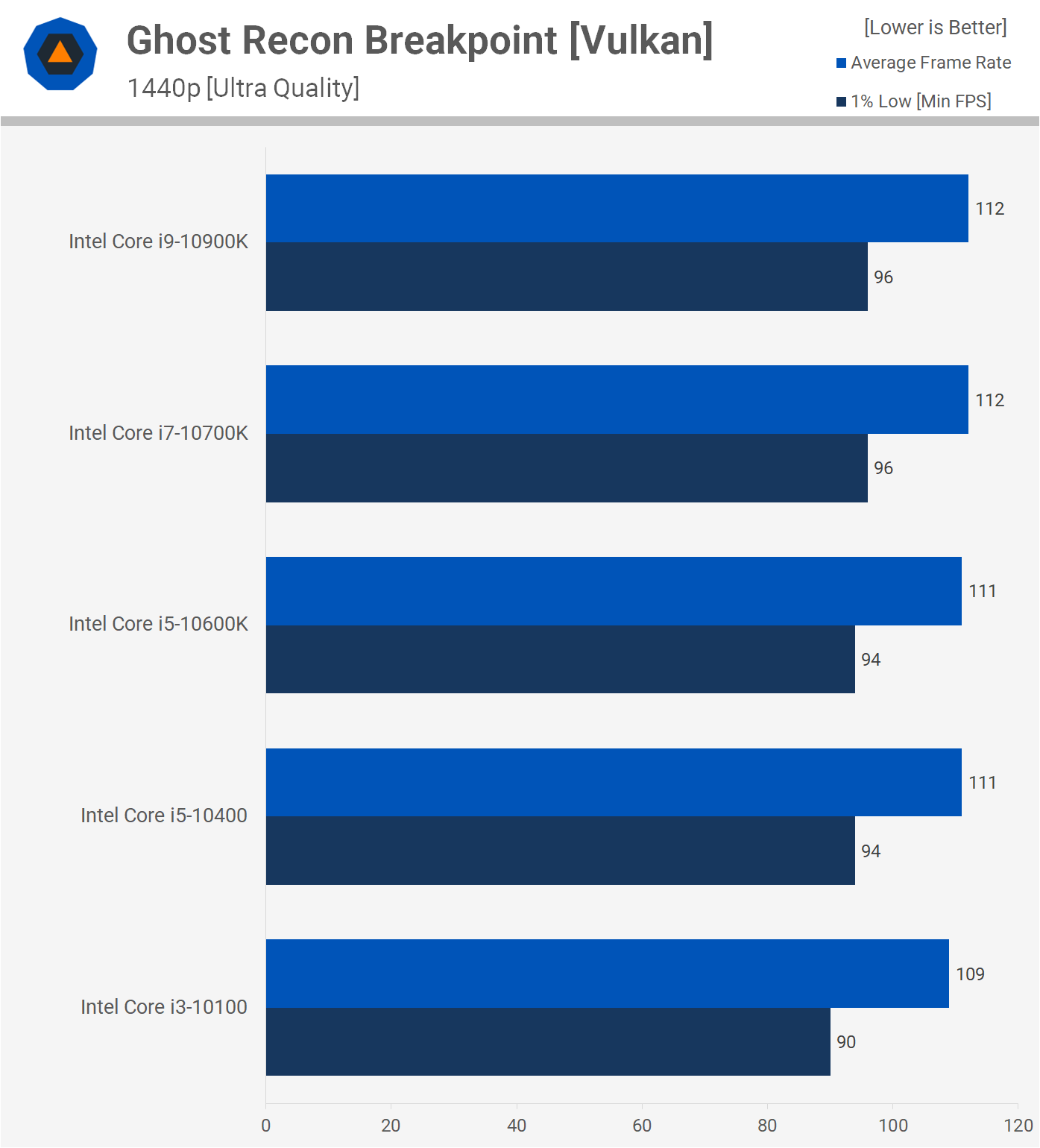 For titles like Ghost Recon Breakpoint that aren't particularly CPU sensitive, you won't notice a big difference between the Core i3-10100 and Core i9-10900K. This is especially true when testing under more realistic conditions such as 1440p. Here the 10900K was up to 7% faster than the 10100 and on average rendered just 3 frames more per second. So for games that don't require more than four cores and aren't sensitive to CPU performance, these are the kind of margins you can expect to find between these 10th-gen Core processors.