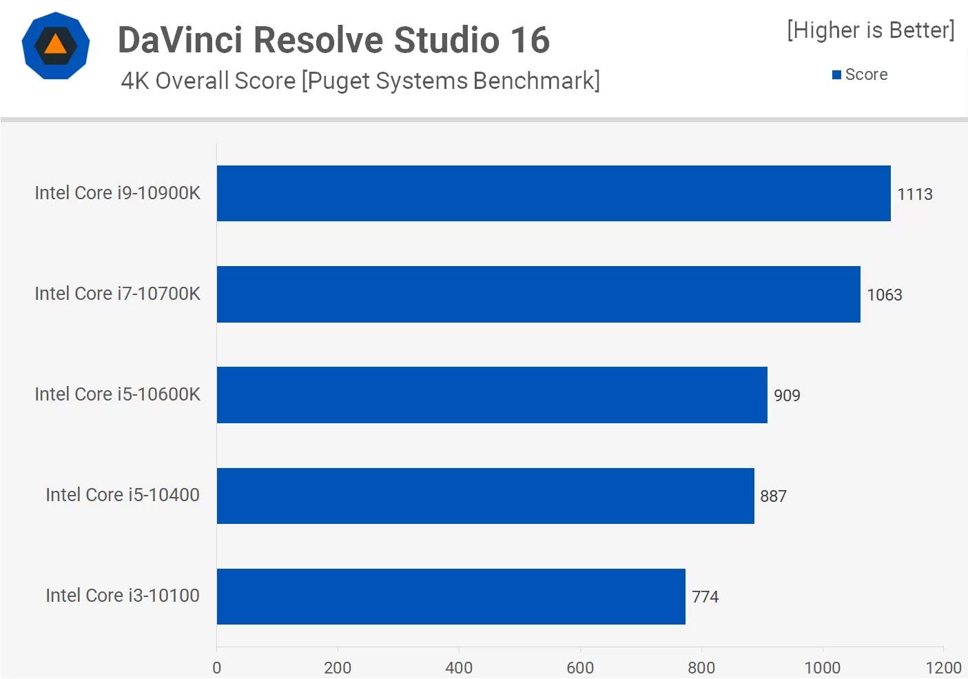 Scaling is more consistent in Adobe Premiere Pro, where we see fairly consistent performance gains as the core count increases. For example, we see a 25% increase when going from the 10100 to the 10400, and a 16% increase from the 10700K to the 10900K.