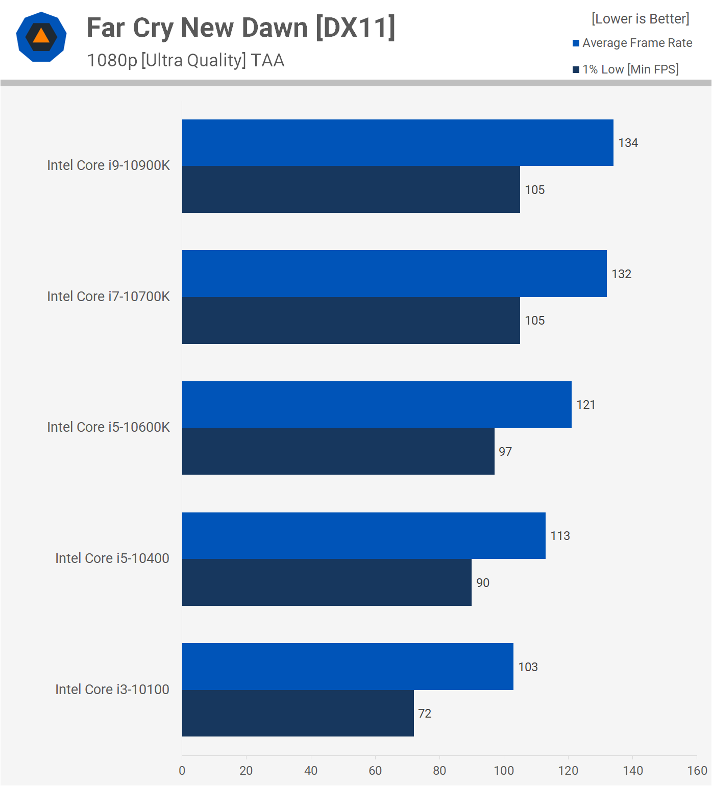 Far Cry New Dawn is very sensitive to clock frequency and cache performance, so we see a reasonably large performance uplift when moving from the 10100 to the 10400. The i5 processor was up to 25% faster. Of course, the jump from the 10400 to the 10600K is much smaller and the 8% increase is in line with the clock frequency difference.