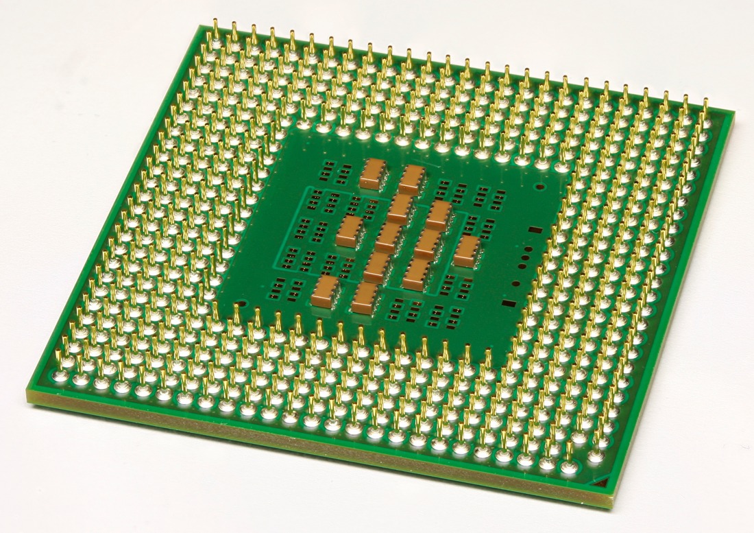 Bottom side of an Intel Pentium M 1.4. The Pentium M represented a new and radical departure for Intel, optimizing for power efficiency at a time laptop computer use was growing fast.