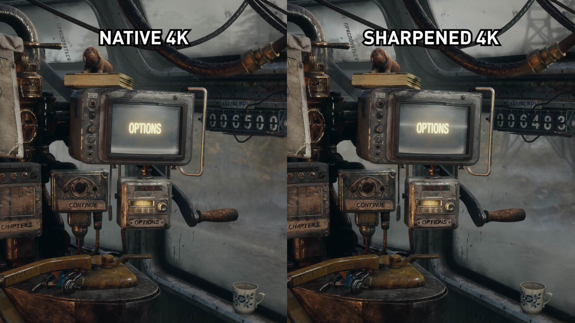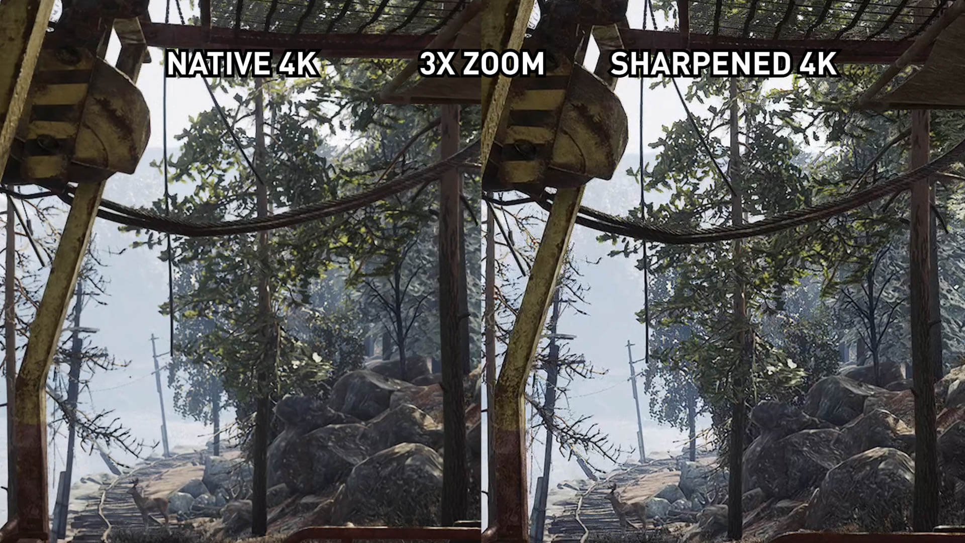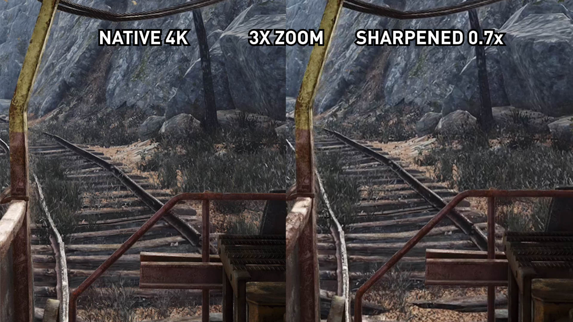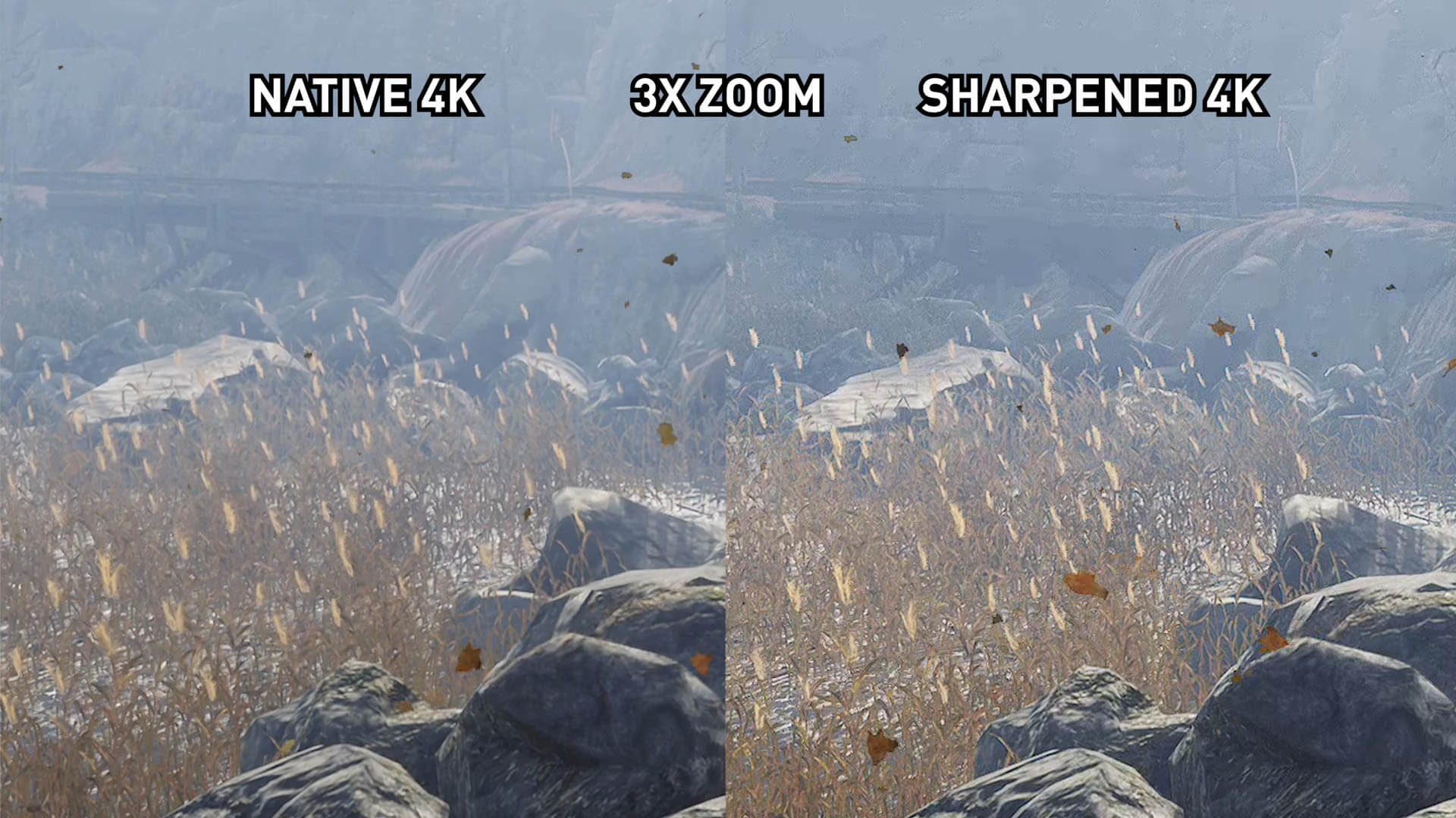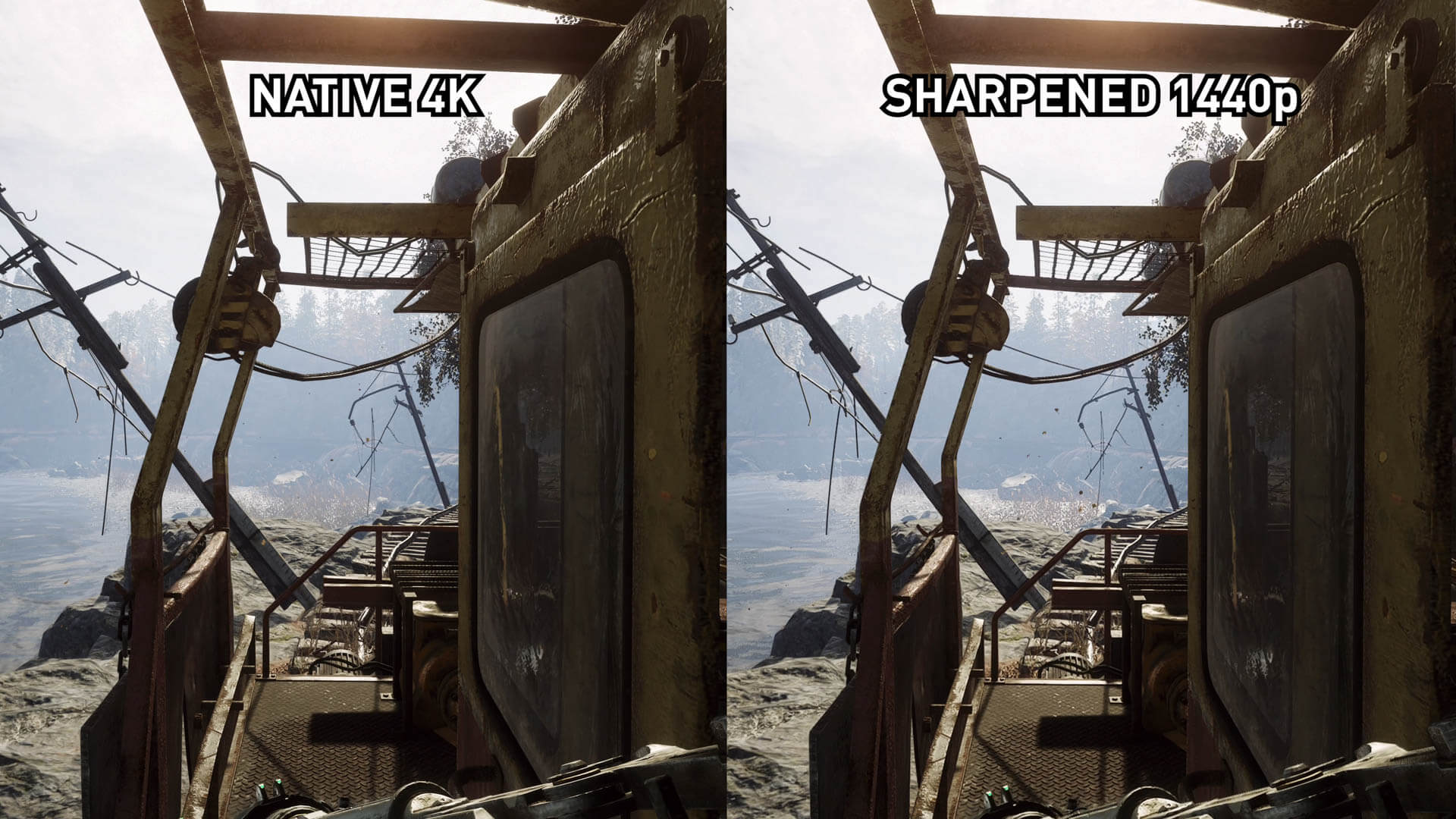 The sharpened 1440p image is a big improvement over native 1440p, but ultimately just doesn't have the same level of detail as the native 4K image. Nearby textures get pretty close, but with some of the fine foliage detail and other small elements, there simply aren't enough pixels and native detail in the 1440p image to simulate a 4K presentation through a post-processing filter.