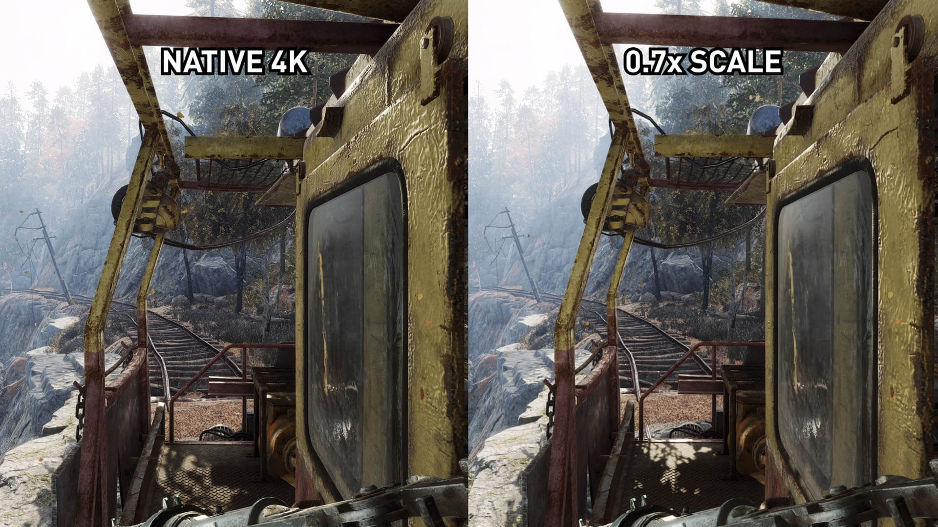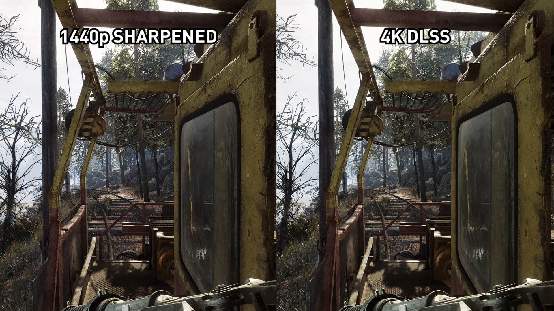 In the best cases, DLSS is as good as sharpened 1800p for large elements and close textures. But DLSS still suffers from the 'oil painting' effect we mentioned in our initial investigation, which looks bad in some environments, and suffers from detail loss especially for rocks and foliage. The way it 'thickens' really fine details like tree branches or wires also degrades the DLSS image in our opinion. Overall, sharpened 1800p gets a lot closer to native 4K than DLSS, at least in Metro.
