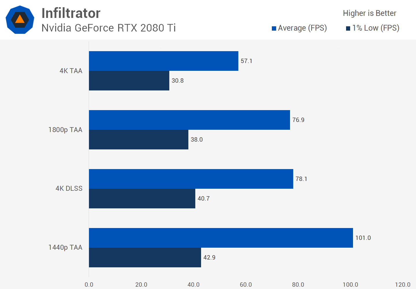 And here's the fun part. Native 1800p rendering delivers nearly identical performance to DLSS in the Infiltrator demo: DLSS is about 2 percent faster in average framerates, and 6 percent faster in 1% lows. Of course, DLSS is a good 37 percent faster than 4K in average framerates, but the key thing here is DLSS is nearly visually identical to 1800p while also providing near identical performance.