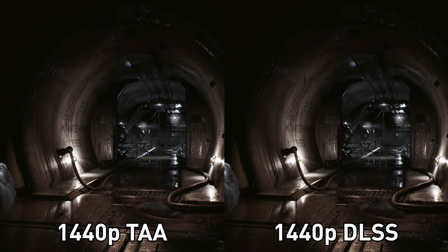 Even applying a sharpening filter using ReShade to try and... I guess cheat a bit and clean up the blurry 1440p TAA image, it's still not as clean as the DLSS image, though it is better than the regular non-sharpened 1440p presentation.