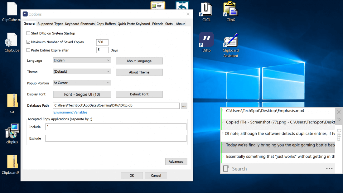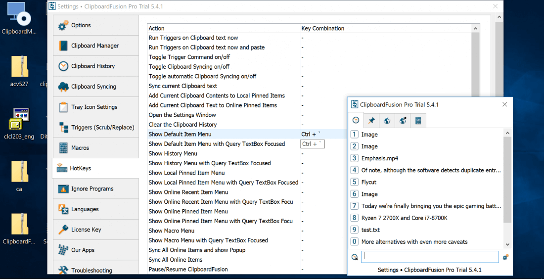 M8 Free Clipboard - Dated, semi-clunky interface (particularly the options menu) and doesn't have features such as detecting duplicate items or many options for hotkeys. However, the software is seamless with the way it shows the full clipboard entry in a pop-up window as you hover, and you can tap a single key to begin editing the item.