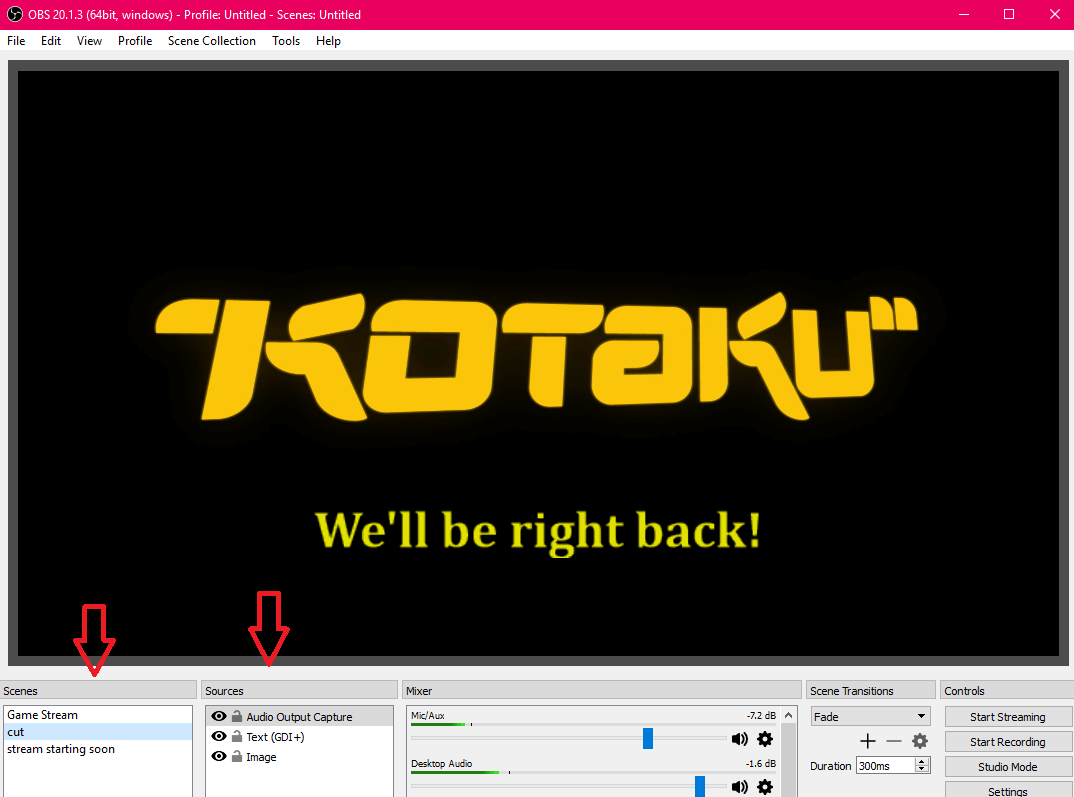 Finally, let's talk about scenes and sources. Sources are sources for the stuff you see and hear on the stream---video games, camera, images, etc. Scenes are different collections of sources that streamers can shift between. So, for example, say that I need to make myself a sandwich and take a break from streaming Overwatch. I might have a logo and the text "I'll Be Right Back" playing on screen along with a song. Those are all sources, and to get all of them to my viewers at the same time, I'll click on the scene, "Be Right Back."