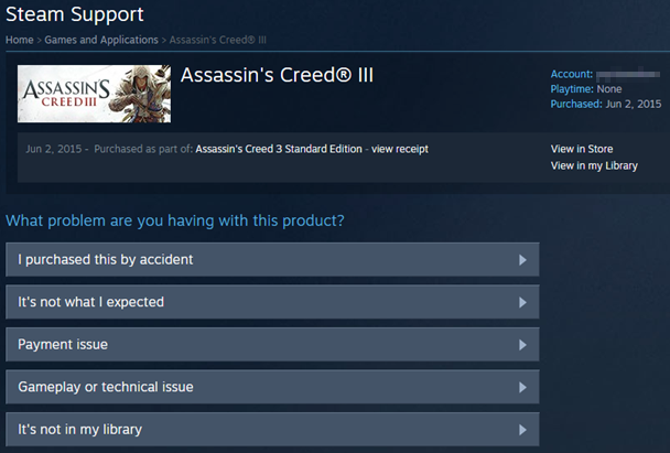 It would be prudent to know exactly what Steam added. Let's go through the new refund flow together. Last night I "accidentally" purchased Assassin's Creed III. It was the first game I saw in the list of best sellers that was inexpensive, old, and provided by a major publisher. I didn't want to cause grief for a smaller developer or new title.