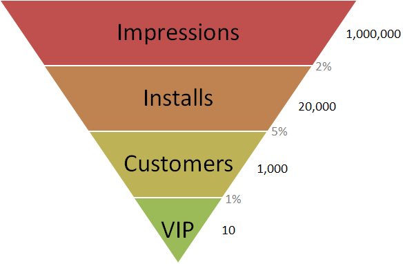 What I've just described is the F2P funnel. Here's a visualization with some example estimations of the number of players at each stage in the funnel.