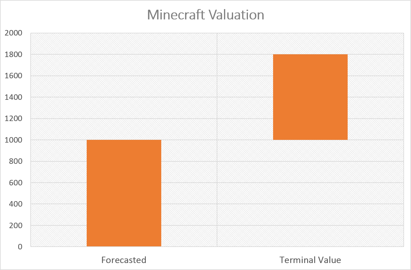 We also assume a 10% discount rate, 50% revenue to equity cash flow and growth equal to inflation in the terminal value. 50% sounds like a lot, but reasonable given Minecraft's mammoth 79% profit margin.