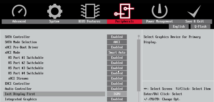 Any of the graphics cards listed above should just work but you must change a couple of settings in the BIOS first. Restart your machine and hit ‘Del’ on your keyboard to bring up the BIOS screen. Under peripherals look for ‘Init Display First’ and Integrated Graphics’ and set them to IGPU and Enabled, respectively.