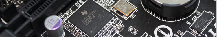 Two USB 3.0 and four USB 2.0 ports are accessible via the I/O panel on the back of the board, while an additional two USB 3.0 ports and six USB 2.0 can be connected via onboard headers. FireWire is also present thanks to the aforementioned Texas Instruments controller (XIO2213BZAY), with one FW400 port on board and two FW800 via headers. Quo takes pride in noting this is the first and only off-the-shelf motherboard in the market with onboard support for Firewire 400 and 800 (1394A and 1394B) connections.