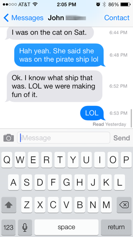 With iOS 7, that's no longer an issue. Simply swipe to the left while in a conversation to see when each message was sent or received. It's convenient that it the timestamps aren't always there to serve as a distraction but can be accessed on-the-fly.