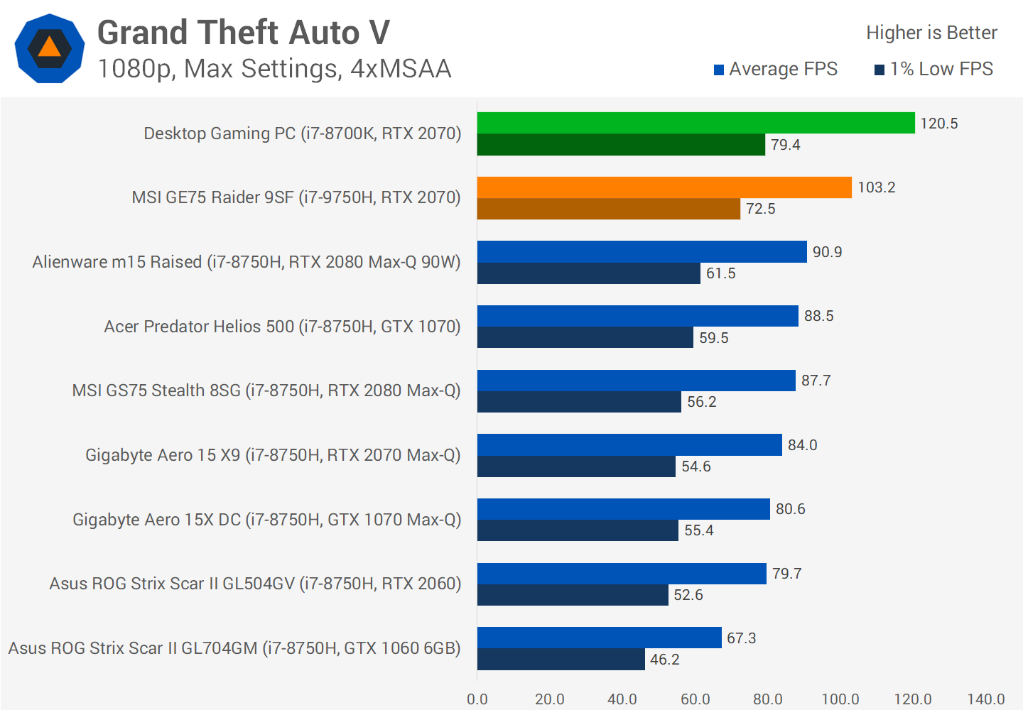 Closing out with Grand Theft Auto V, the oldest title we tested but also a quite popular one still. The desktop RTX 2070 holds a 17 percent advantage in average frame rates but the damage to 1% lows is limited to just 10 percent which is one of the smallest differences we've seen so far.