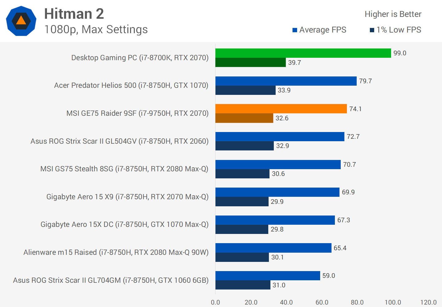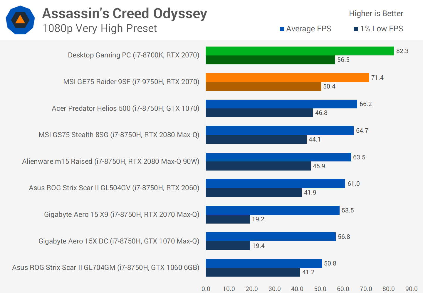 While this is generally the case, there are also times where a desktop's other advantages assist with performance. A faster, less power constrained CPU helps with 1% low performance, as does faster memory, depending on where the bottlenecks lie. Better cooling capabilities allow the desktop to cope with a wider range of operating conditions without throttling. And, of course, the desktop has much higher scope for overclocking, which is typically limited or non-existent in laptops.
