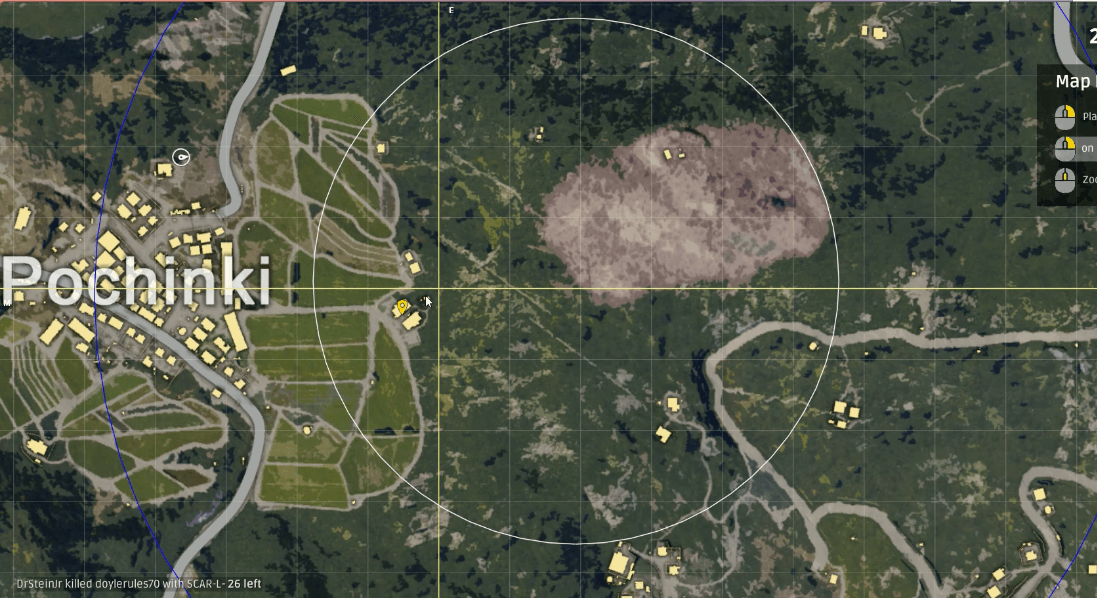 After you've grabbed your weapons, you need to know where to go. If you open your map, you'll see a large white circle. This is the playzone, and you're going to want to eventually move inside it. As the match goes on, that zone gets smaller and a second, blue circle will appear. If you're outside the blue circle, you'll take damage. The blue circle moves faster and does increased damage over the course of the match, so you want to always be aware of it.