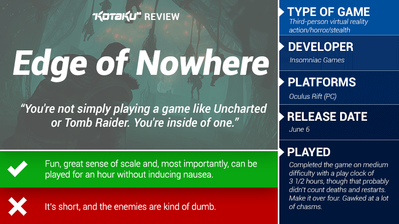 Edge of Nowhere's primary question is whether a perfectly standard type of video game is worth putting into virtual reality. There's nothing about it that demands it be experienced in VR. Given how frequently the player must simply look ahead to keep their focus on the lead character, there's barely any gameplay impact. But the sense of scale that VR provides a game like this is remarkable. The comfort with which you can play this game is an example for other VR developers to follow. Yes, it is good and satisfying and even spectacular to play a traditional third-person action adventure in virtual reality.