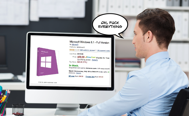 You start to think about how Apple made their OS free, and how the operating system on an Xbox One is free, and why the hell hasn't Microsoft just gone ahead and made Windows free already, and then you punch in your credit card information anyway because life is unfair and sometimes you just have to pay too much for something you don't even want because let's face it, you're not going to learn Linux anytime soon.