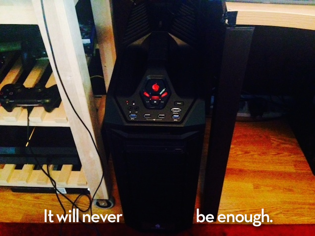 Over time, the whisper becomes a murmur. What if you got a liquid cooling system? You could probably get a few more Mhz of CPU speed. Did you see that deal Newegg is having on 780 Tis? You could probably get one of those. Or two! Think about how good it would feel to make your PC faster...just a little faster...