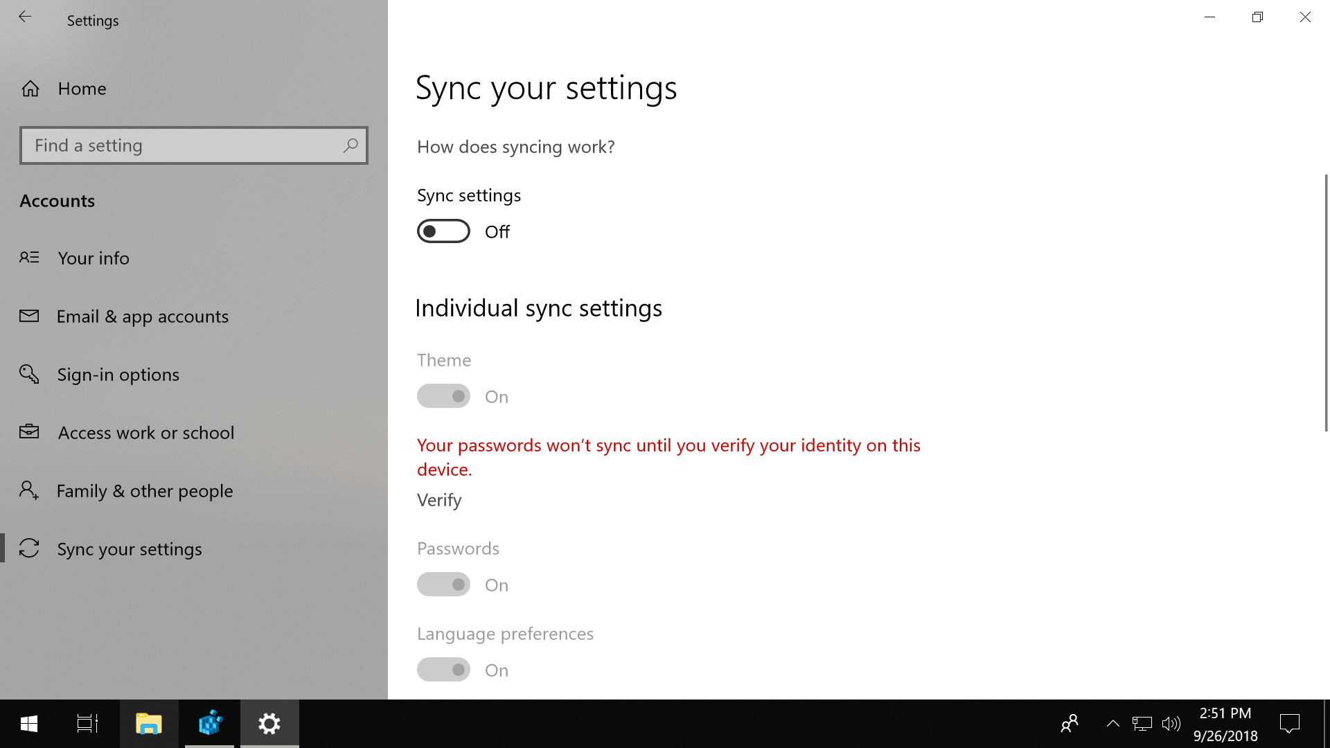 The synced data includes your theme profile, passwords, language preferences, as well as ease of access and other Windows settings, which can be disabled individually or entirely by going to the Settings app > Sync settings > Settings > Accounts > Sync and turning items off.