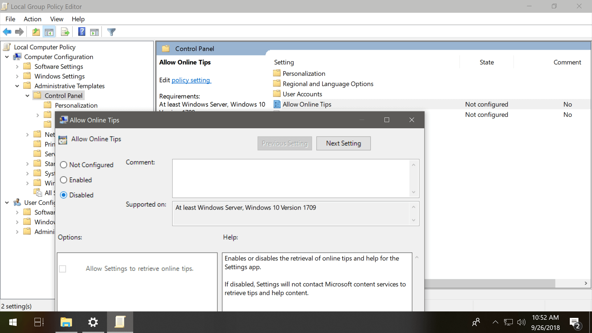 - Double-click the policy "Allow Online Tips" and choose "Disabled" on the window that opens and click Ok