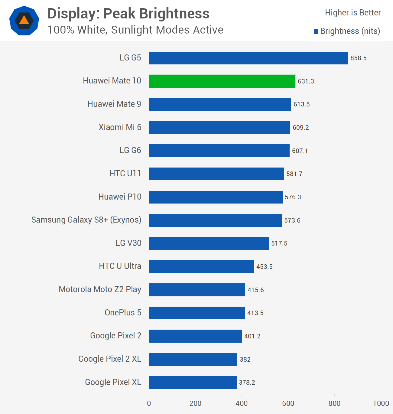 The Mate 10's display ticks a lot of boxes: excellent viewing angles with minimal color shift, a high maximum brightness above 630 nits, and a great contrast ratio for an LCD of near 1600:1. Unlike some other large-screen displays we've seen recently, such as in the Pixel 2 XL, there's no burn-in concerns or uniformity issues: this LCD is much higher quality.