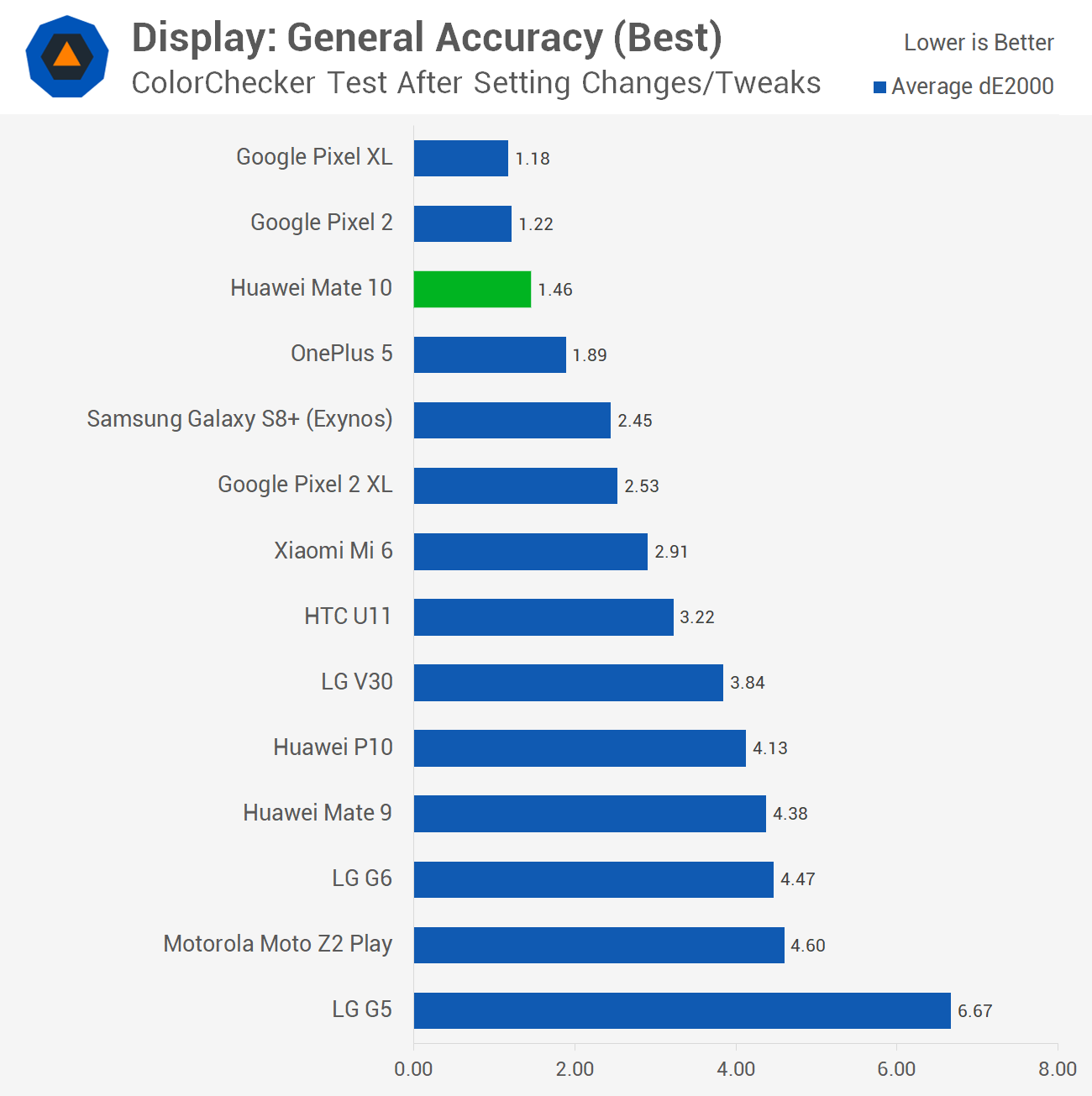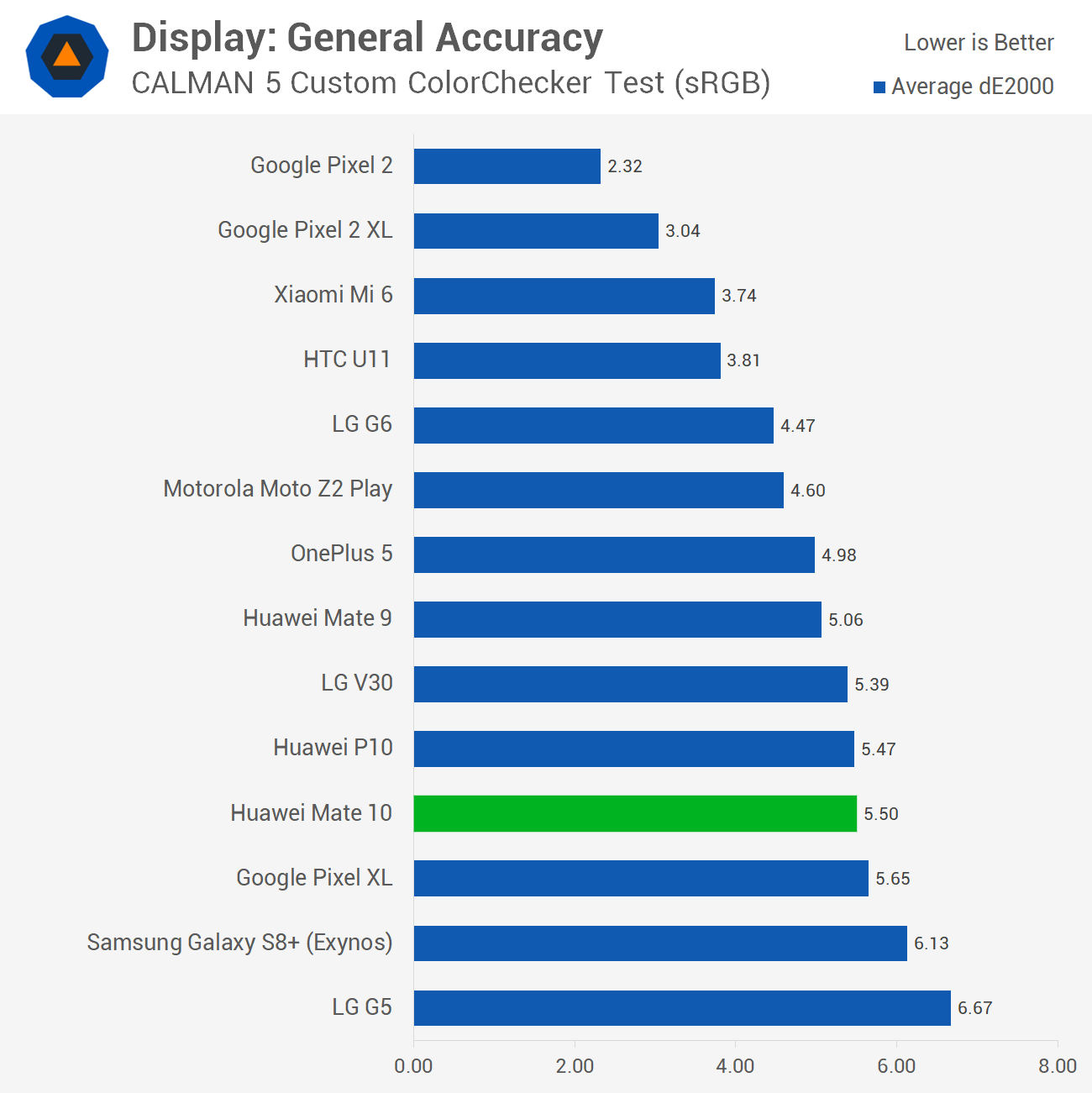 With these modifications made, the Mate 10's display produced dE2000 values less than 2.0 across the board, which is excellent. It's not super easy to create this color accurate mode, as it requires manual fiddling with color temperature, but the display appears to support a near-perfect sRGB reproduction should you want it.