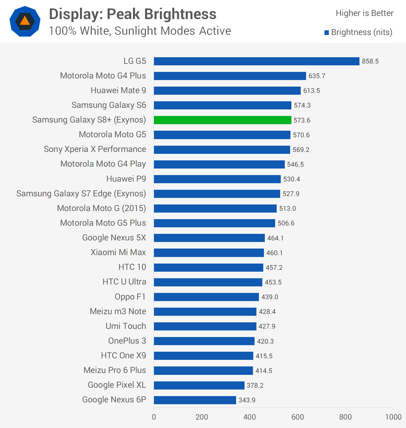 Samsung tend to produce quality phone displays, and the Galaxy S8+'s panel is no exception. As it uses AMOLED technology, its contrast ratio is unparalleled thanks to deep blacks. Viewing angles are excellent and exhibit almost no color shift at off angles, which is another benefit to AMOLED tech. Samsung also manages to produce a very bright AMOLED panel: this one tops out at over 570 nits, which puts it firmly in LCD territory and makes it easy to view in direct sunlight.