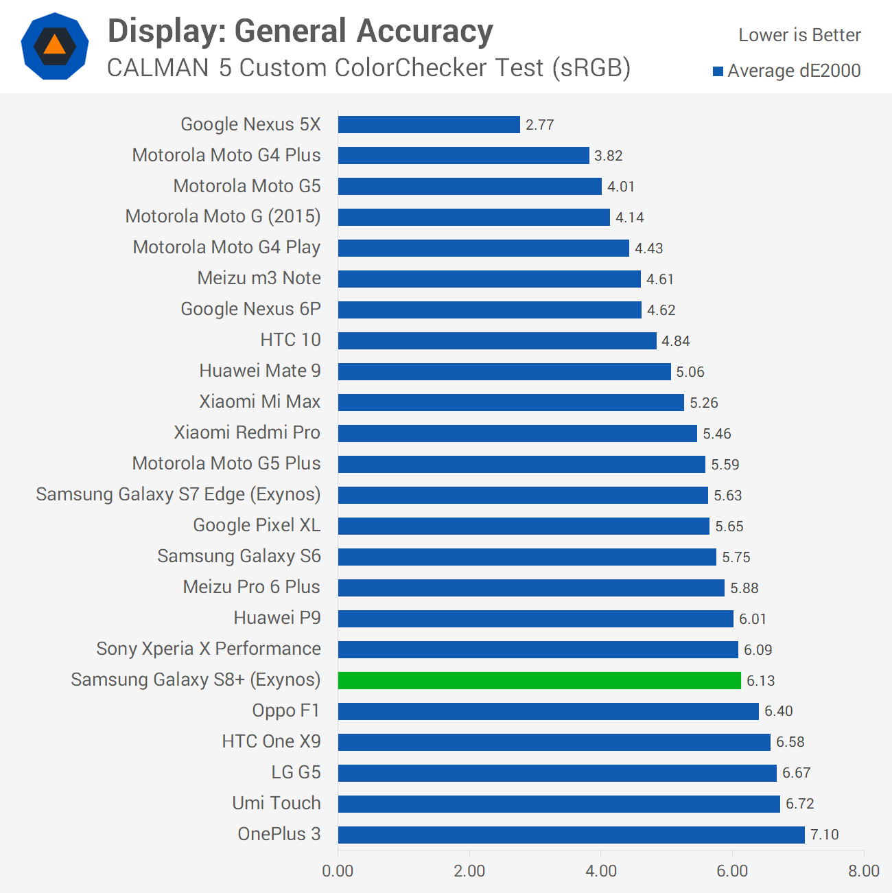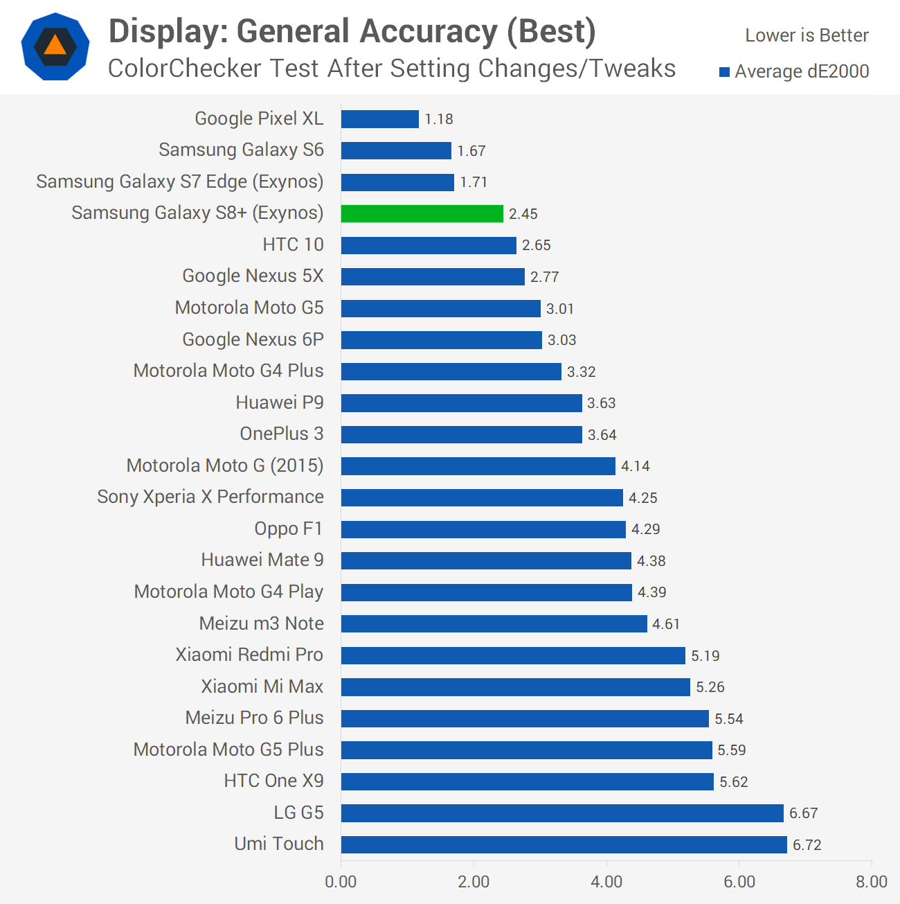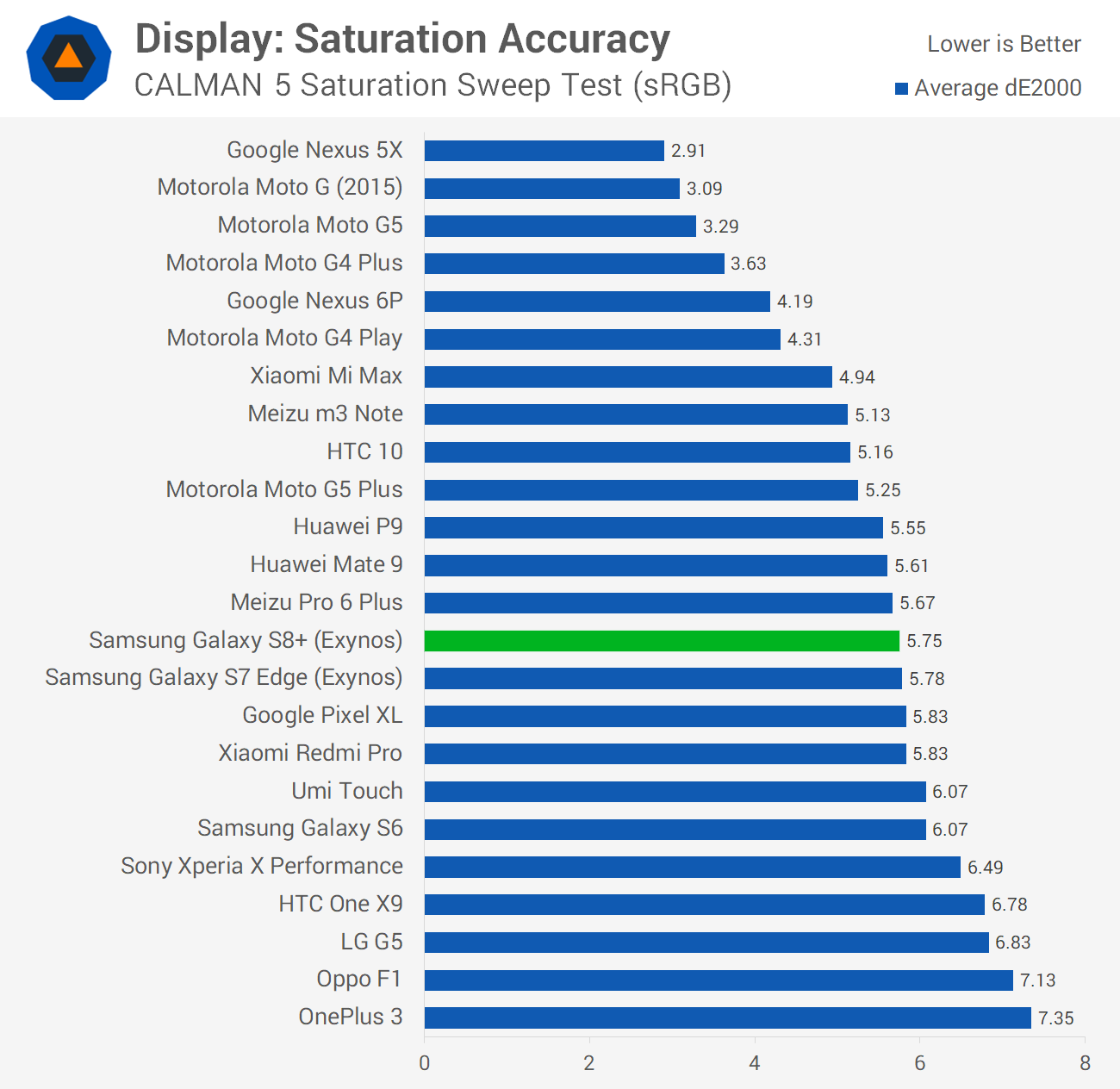 You can correct the display's color performance somewhat by heading into the display settings and switching to 'basic' mode. This does make the OS look like trash, as Samsung has designed it with the screen's oversaturation in mind, though if you need color accuracy, it's as good as it gets. Unfortunately, the S8+'s basic mode wasn't as strong as its predecessor, but it comes close to achieving good sRGB performance.