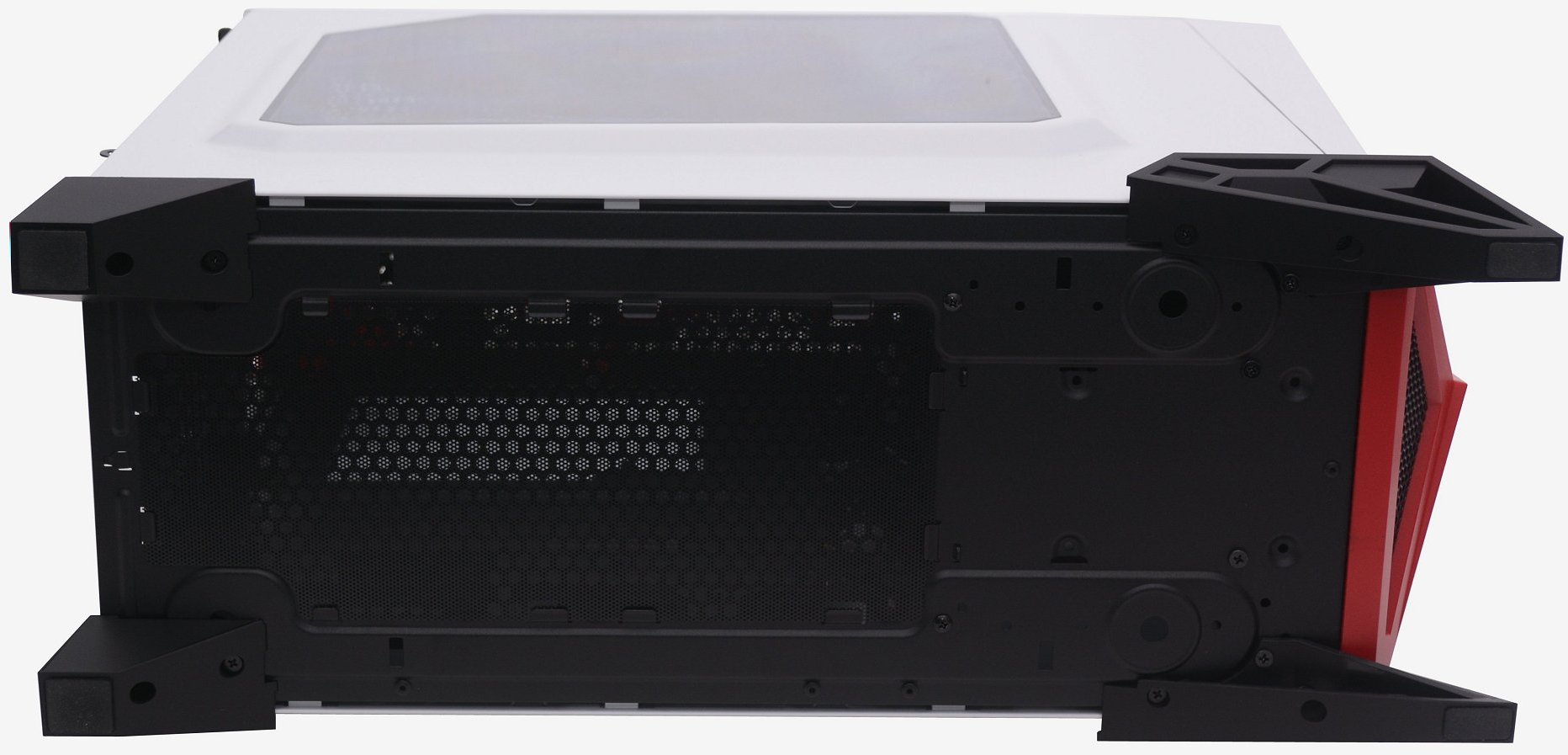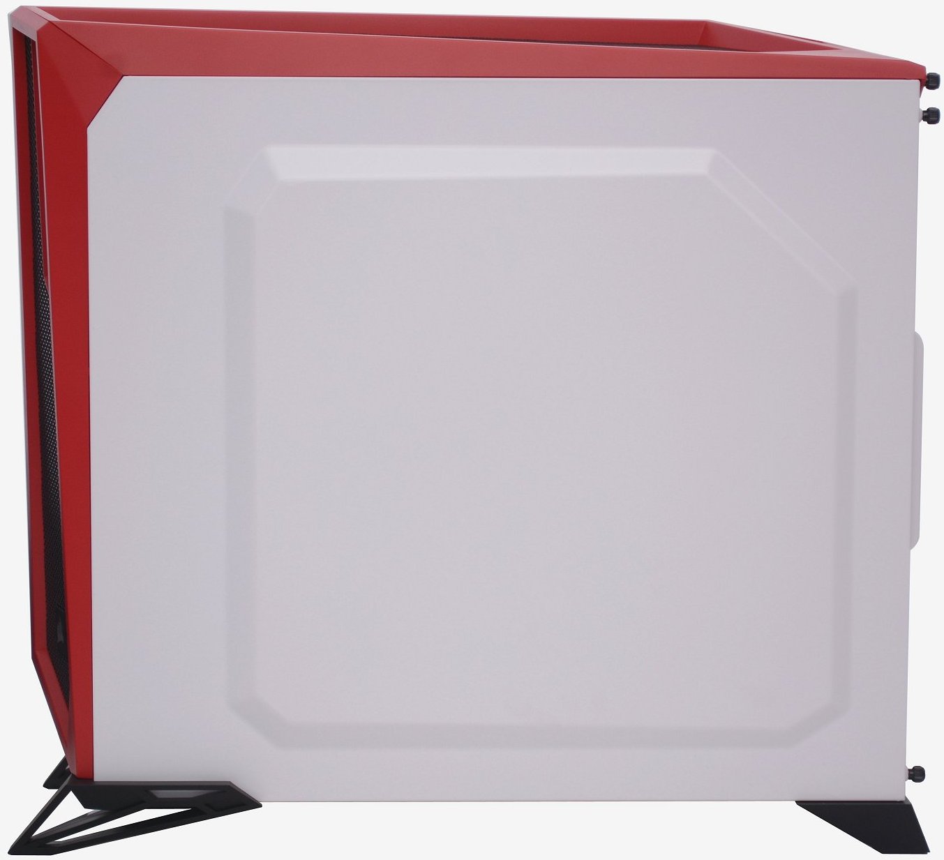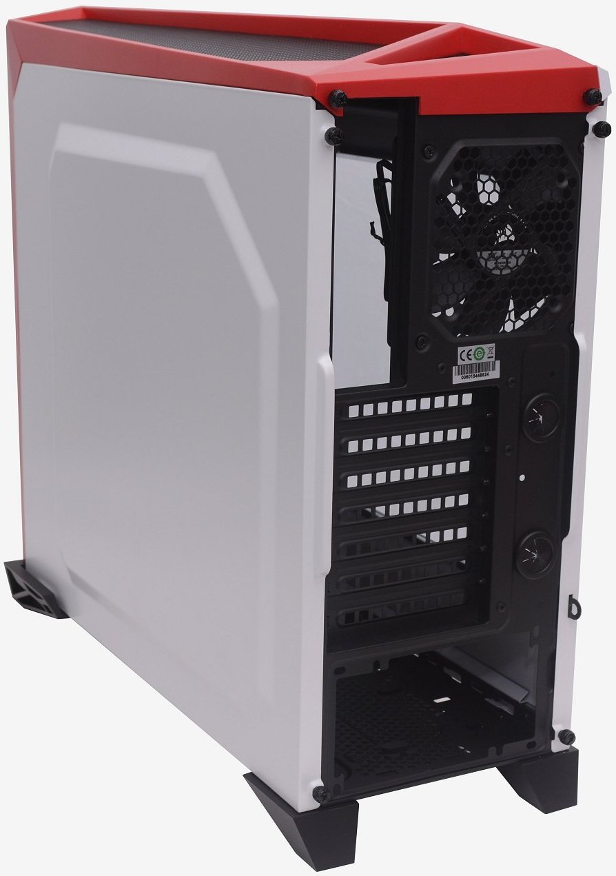 From the right side we find a solid white door panel which has been given a nice white paint job that almost has a hint of pearl in it. A large section of the door has been pressed out to provide additional room inside for routing cables behind the motherboard tray. Even from this angle, the Spec-Alpha looks impressive, with the front and top red highlights and those aggressive angular feet at the bottom, which we will discuss in more detail shortly.