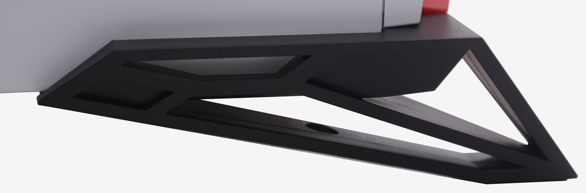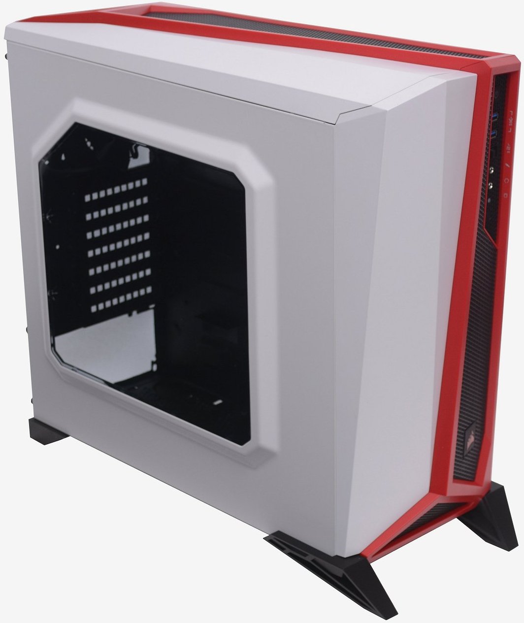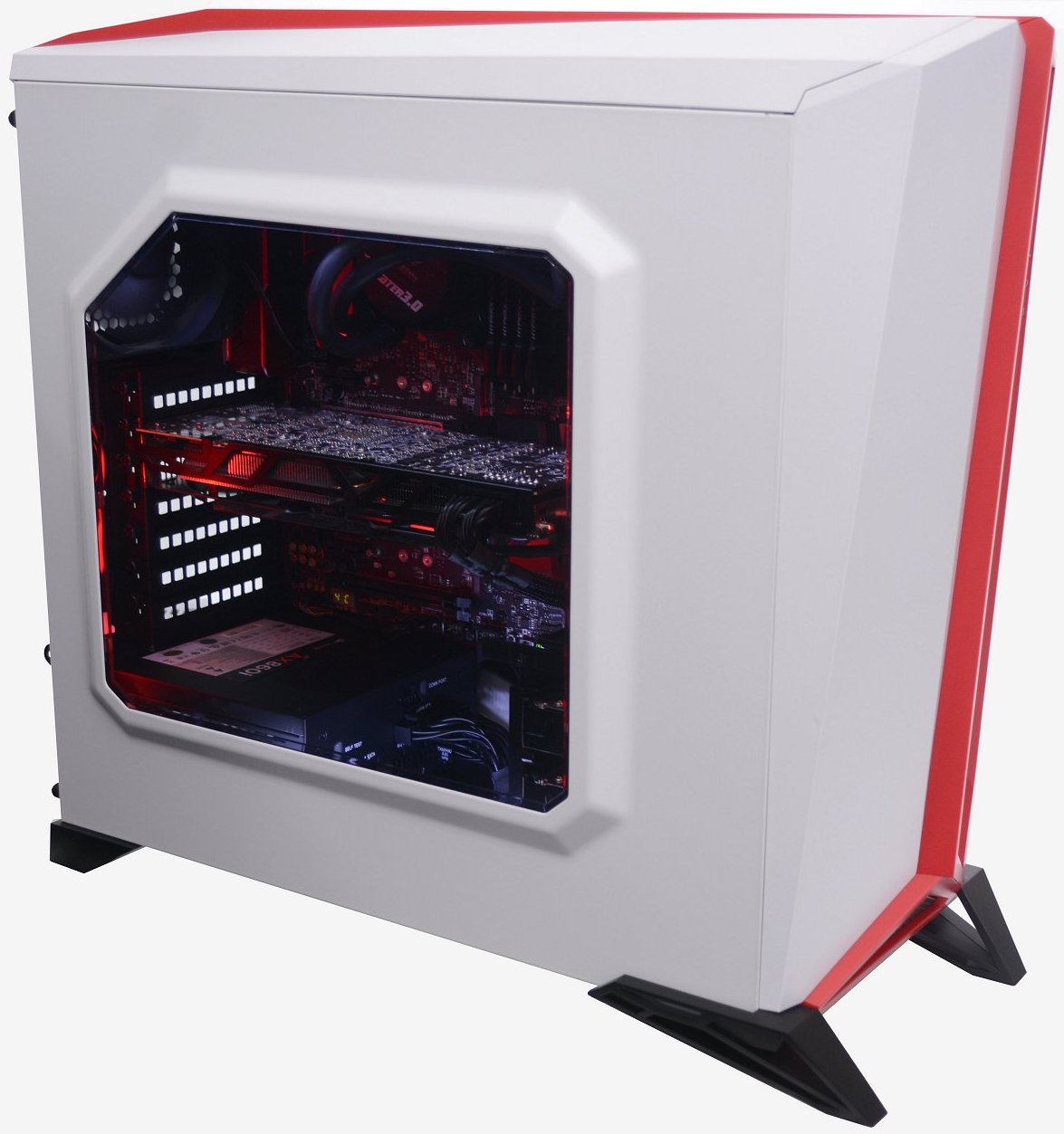 From the right side we find a solid white door panel which has been given a nice white paint job that almost has a hint of pearl in it. A large section of the door has been pressed out to provide additional room inside for routing cables behind the motherboard tray. Even from this angle, the Spec-Alpha looks impressive, with the front and top red highlights and those aggressive angular feet at the bottom, which we will discuss in more detail shortly.