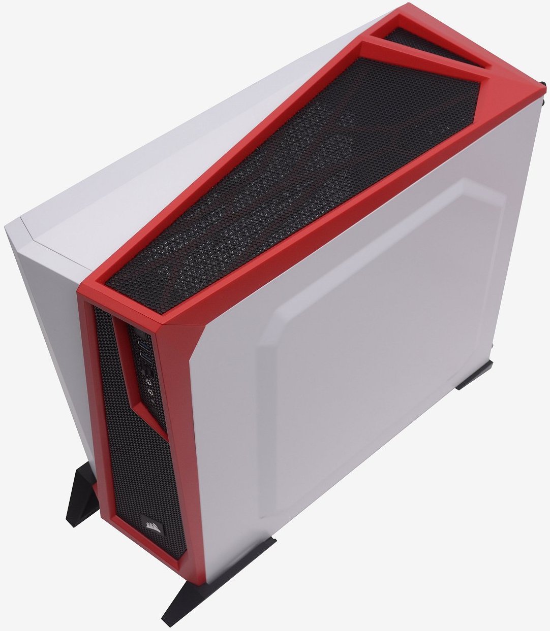 Up top we find a similar look to that of the front, with the black mesh and red bezel to the right, and the angled solid white panel to the left. Even from above, the Spec-Alpha looks great, and I particularly like the subtle look of the red spider web type design under the honeycomb grill.