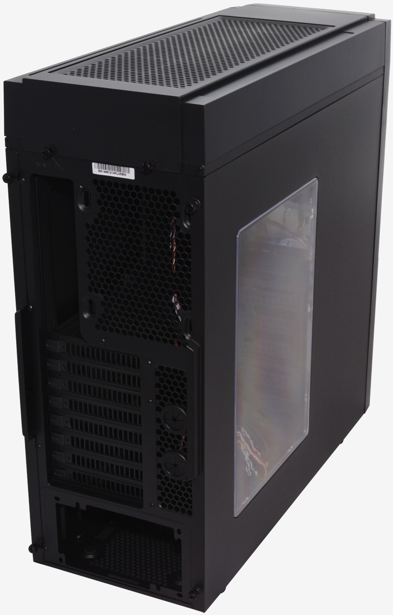 Around back, the KL05 is painted black as you would expect. At the bottom is the power supply bracket, followed by eight expansion slots and two circular holes with grommets for routing water-cooling pipes externally. Above all that is a 120mm exhaust fan mount and the motherboards I/O panel slot.