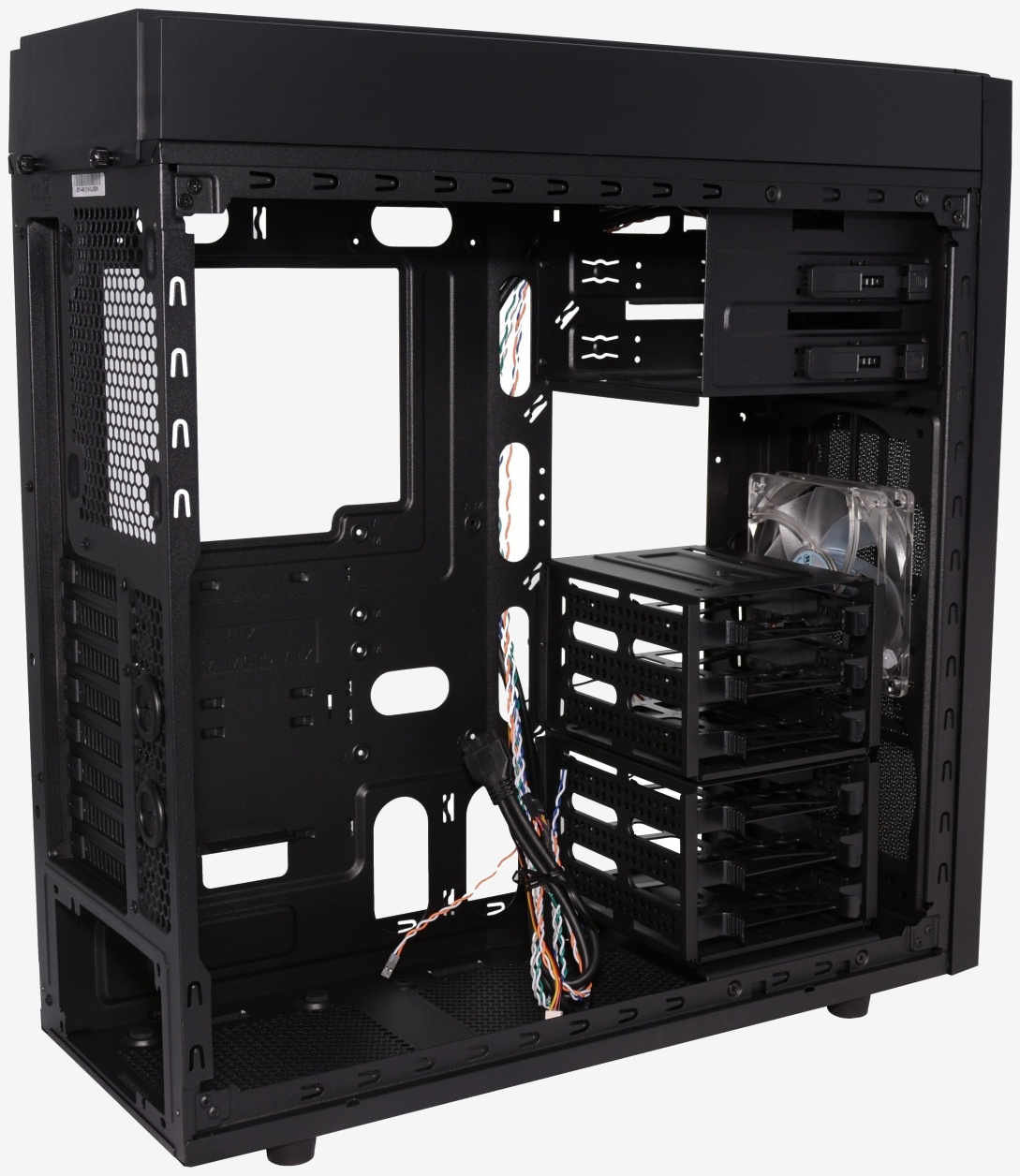 With the side door removed we get our first look inside the Kublai KL05B. There is a lot less to talk about than on the outside as the inside is fairly basic. That said, all the important stuff is included such as tool-less drive cages, cable management features, motherboard socket access and plenty of opportunities for cooling upgrades.