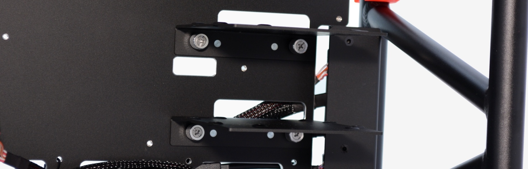 The D-Frame Mini supports three 3.5" or 2.5" drives along with two 2.5" drives, which is the same configuration used by the much larger D-Frame. There are also two 120mm fan mounts included, though the fans themselves must be purchased separately. These mounts also support 120mm or 240mm radiators, giving the D-Frame Mini the ability to accommodate liquid cooling systems.