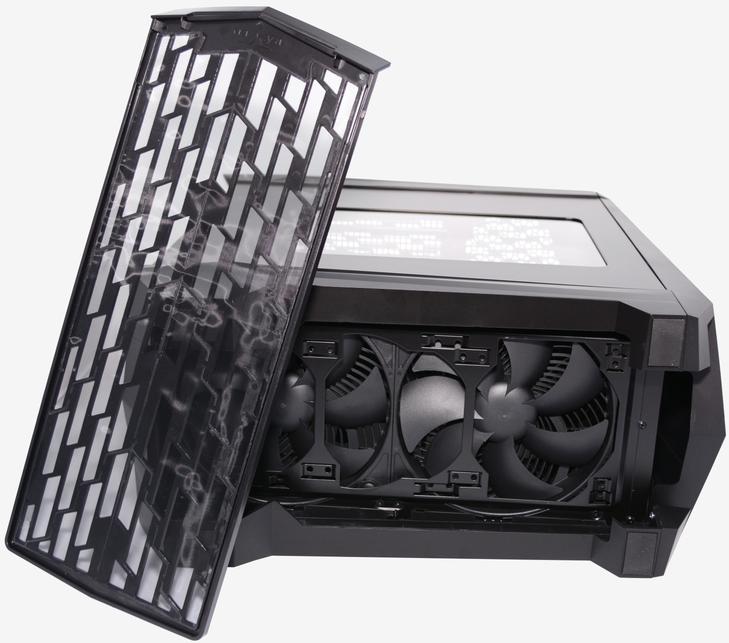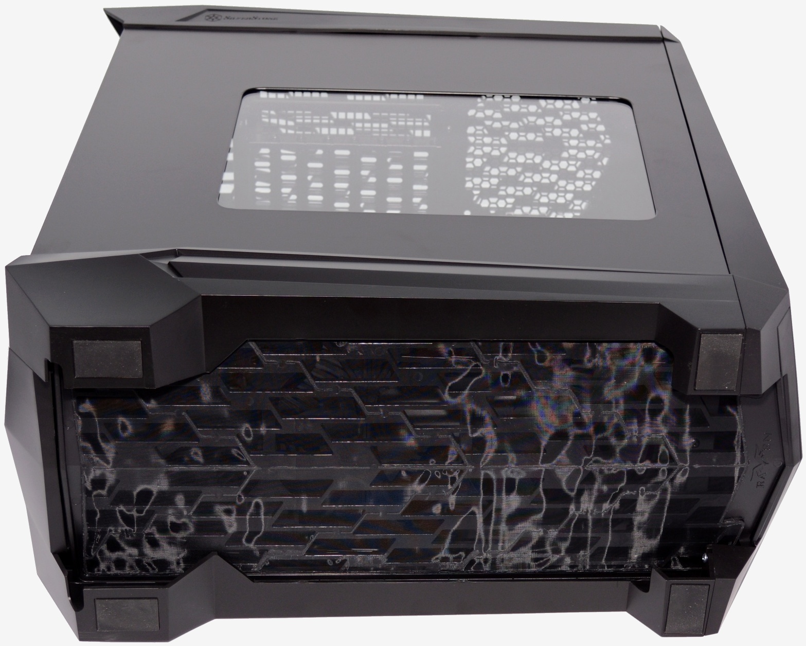 With the system's guts rotated by 90-degrees, the motherboard and expansion connectivity protrude from the top of the case and are covered by a well-ventilated lid that is easily removable. The lid itself looks aggressive with sharp, unusual lines.