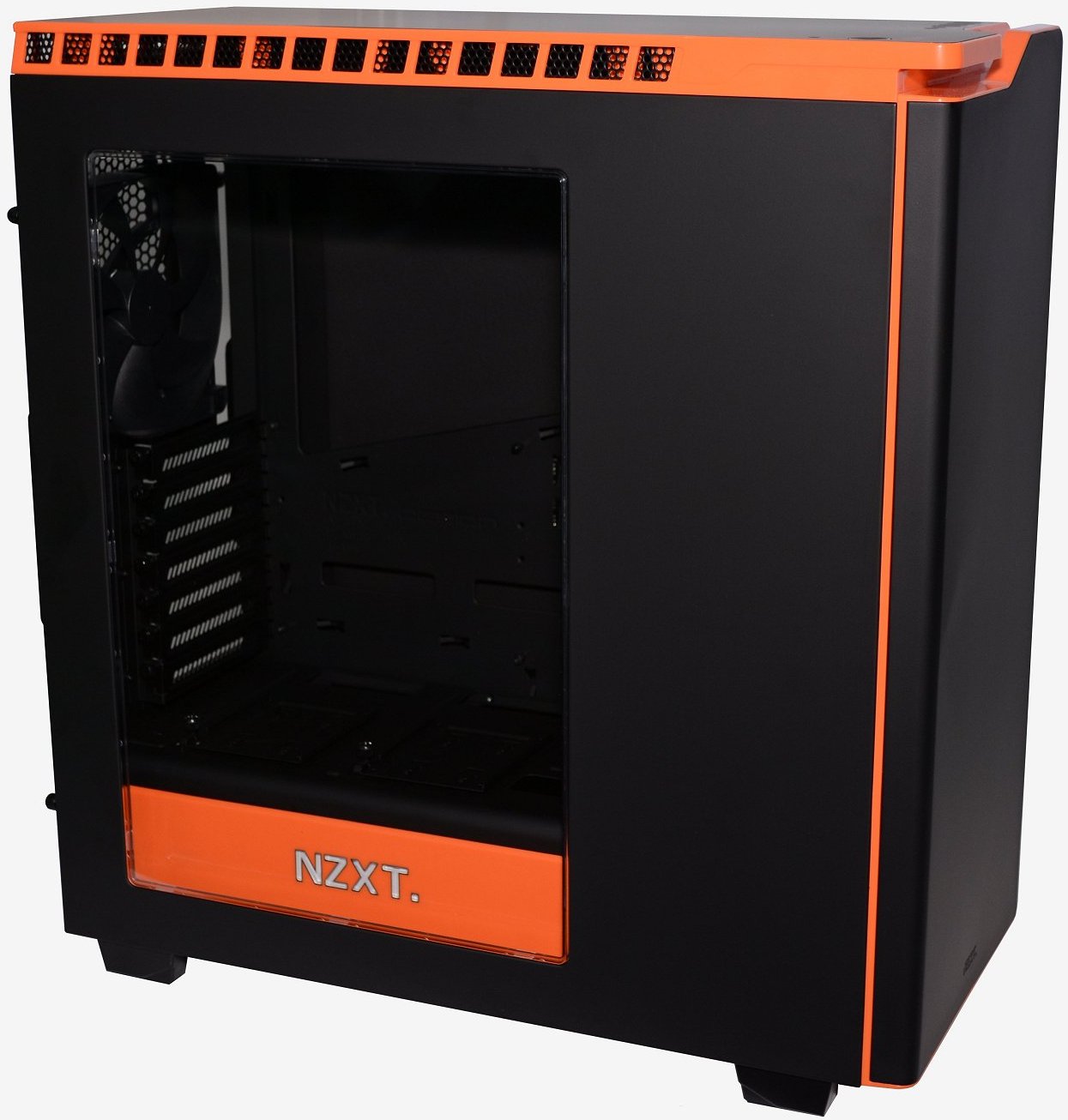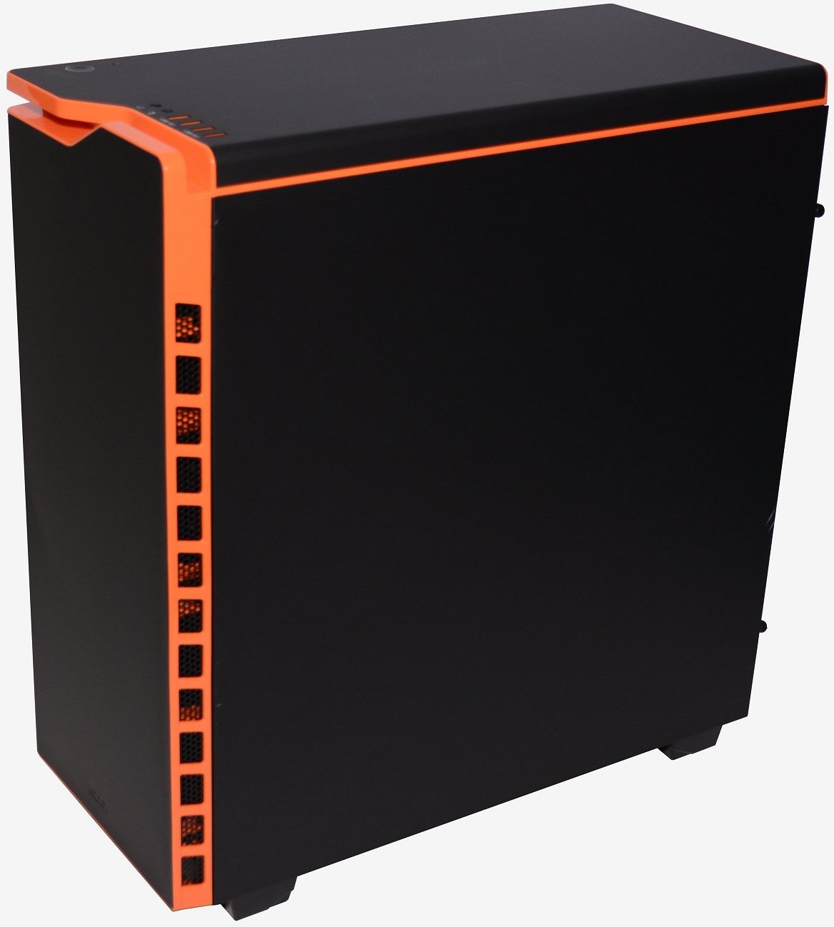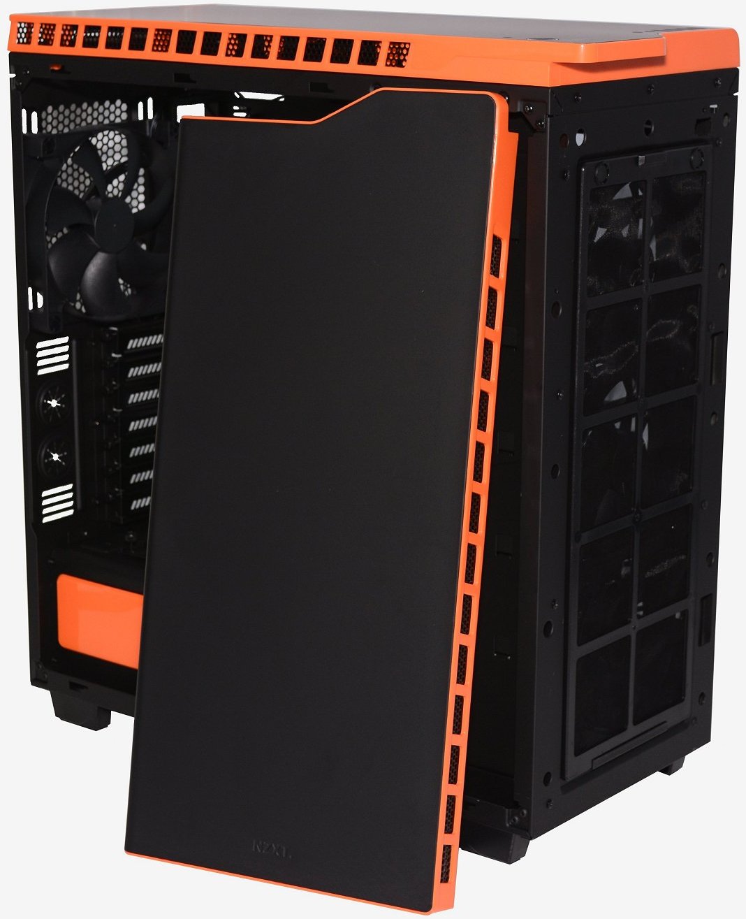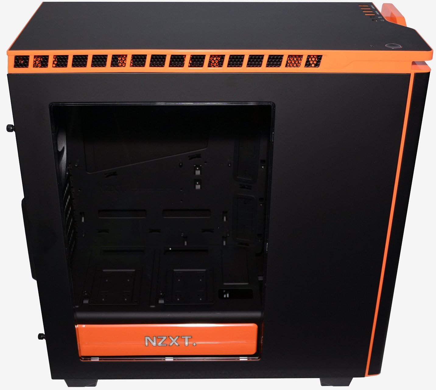 The front cover has a colored border, in our case orange, while the top left cover features a small cut out that can be used like a handle for removing the panel to clean the dust filter covering the in-take fans.