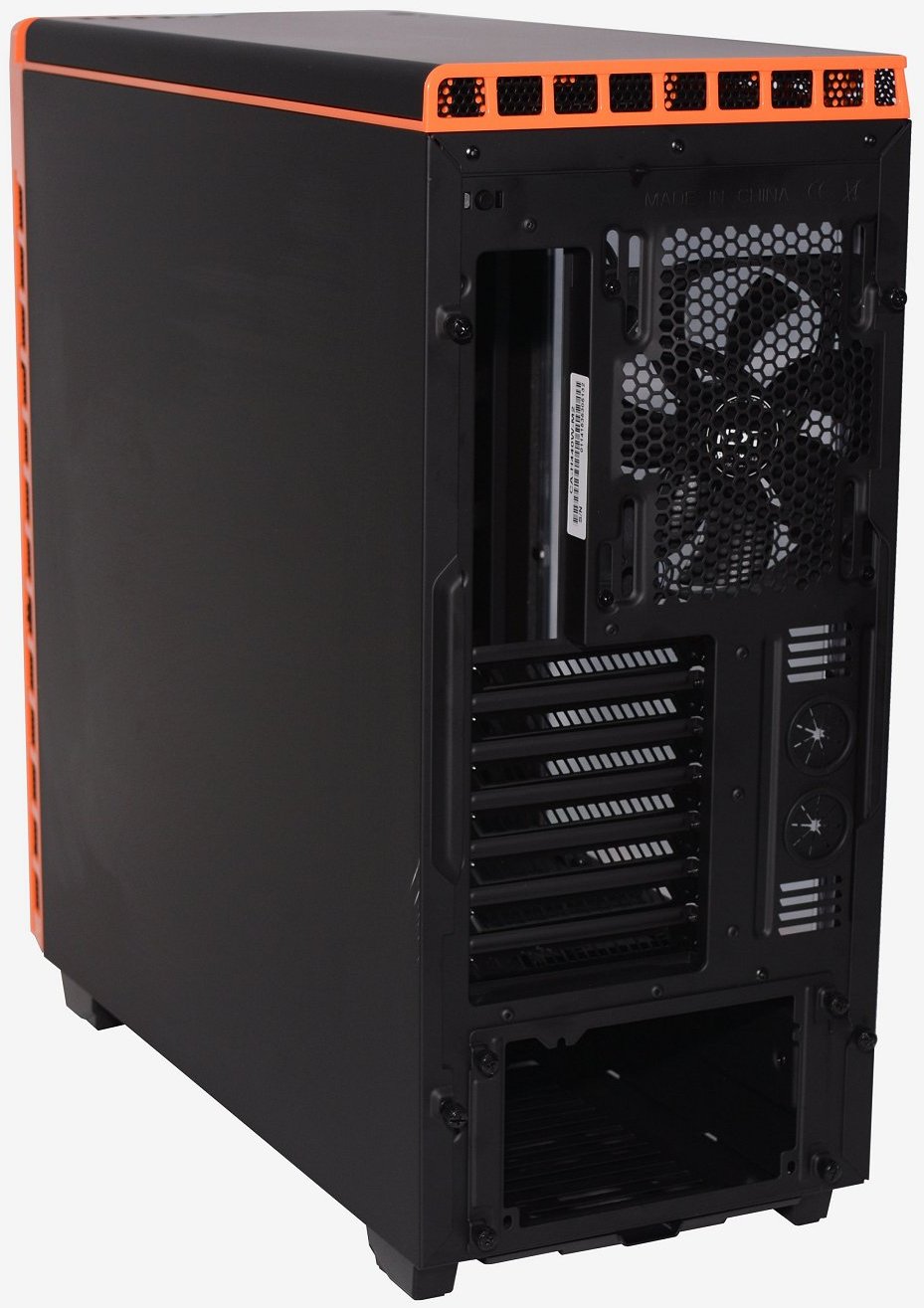 Around back, users will find a removable PSU bracket that is secured with four thumbscrews. Above that are seven expansion slots and a pair of inch-wide water-cooling access points. At the top, we have the motherboard's I/O panel along with a large fan grill that supports 120mm as well as 140mm fans.