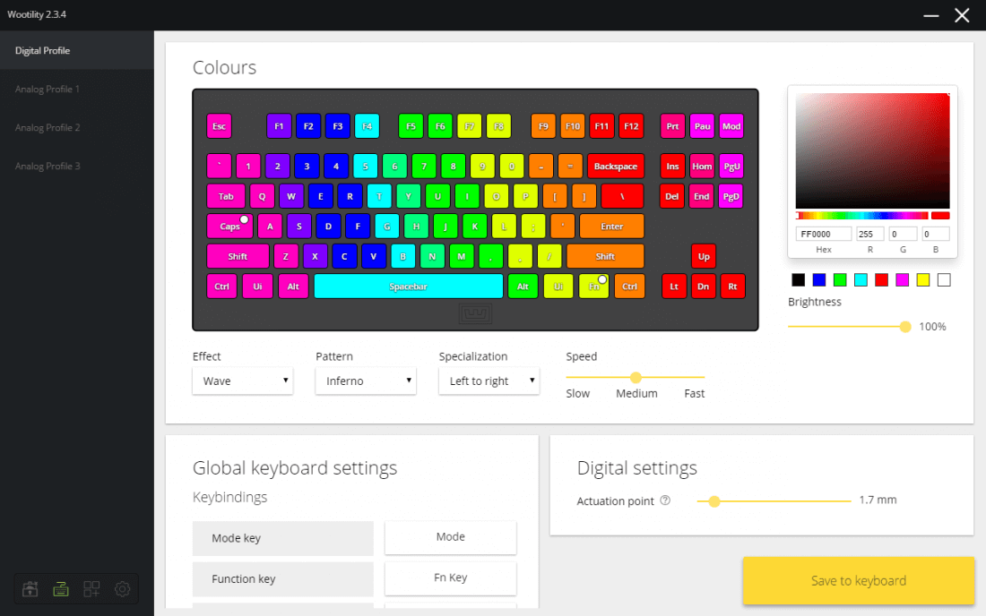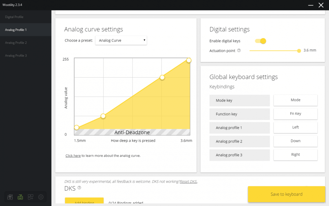Wootility comes with four customizable keyboard profiles, three of which are "analog" profiles intended for gaming.