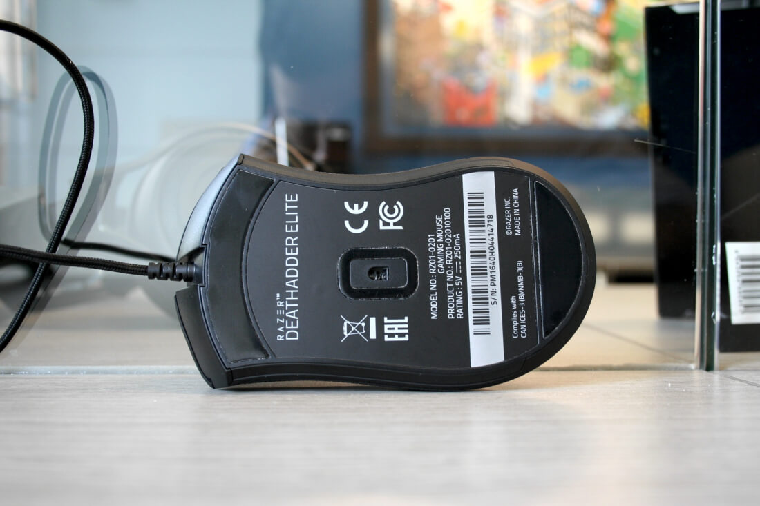 The bottom of the Elite features two oversized teflon feet above and below the all-new "5G Optical Sensor" which boasts a DPI range that stretches from 100 DPI all the way up to 16,000 in 100 DPI increments, as well as 99.4 percent resolution accuracy and tracking speeds of 450 inches per second.